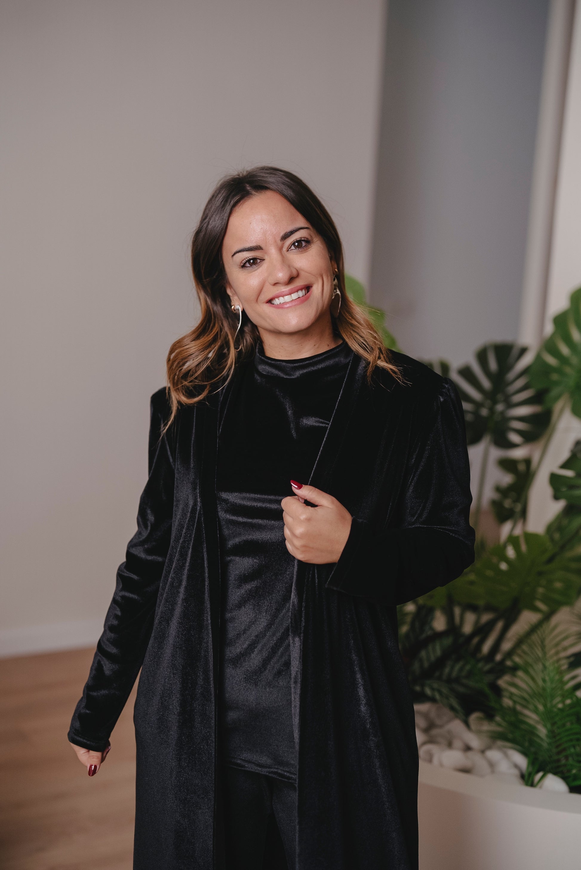 Abrigo de manga larga y cuello solapa, No tiene bolsillos. Se puede combinar con el pantalón es en el mismo tejido.