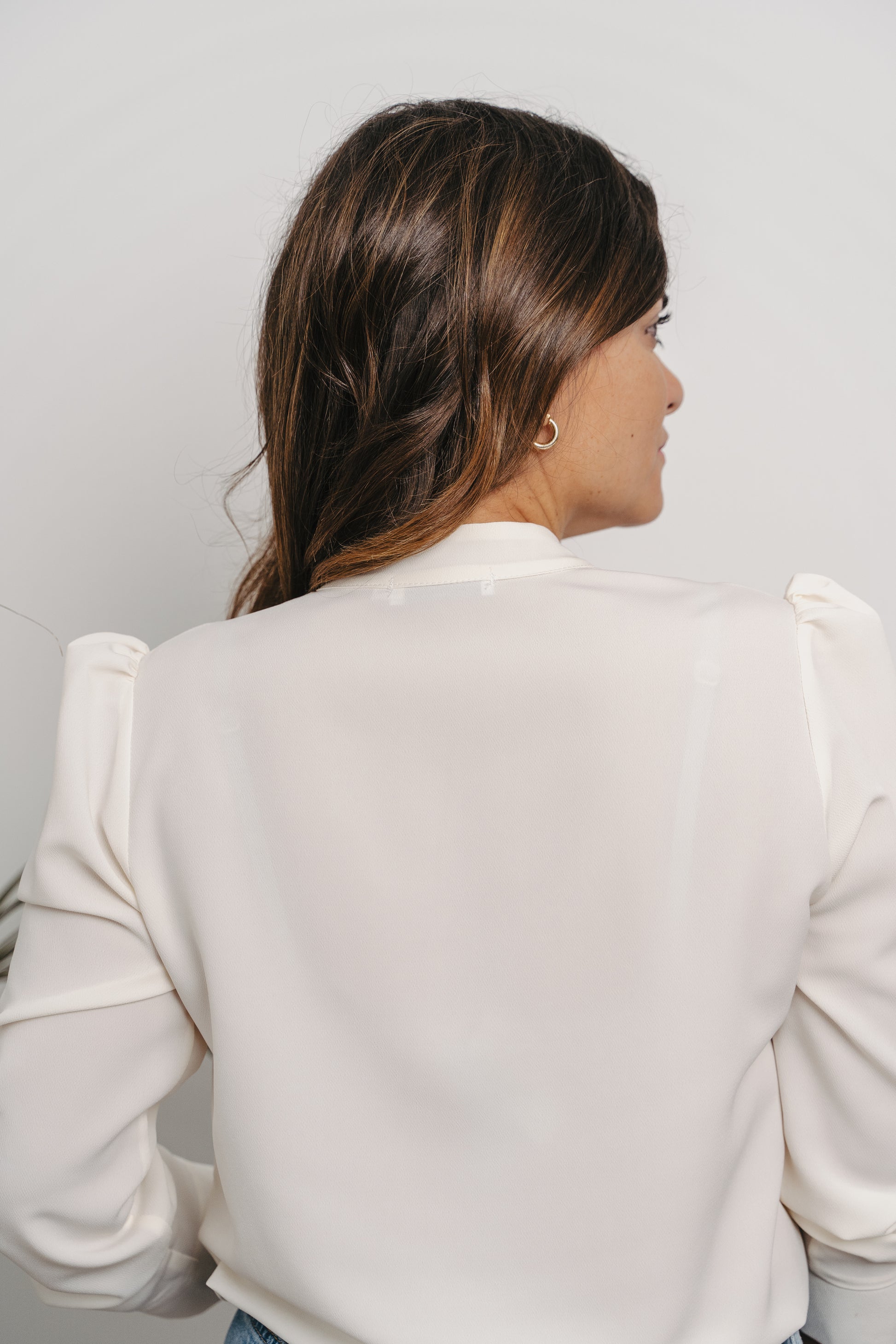 Blusa de manga larga y cuello mao, con detalle de lazada en el cuello y hombro abullonado.