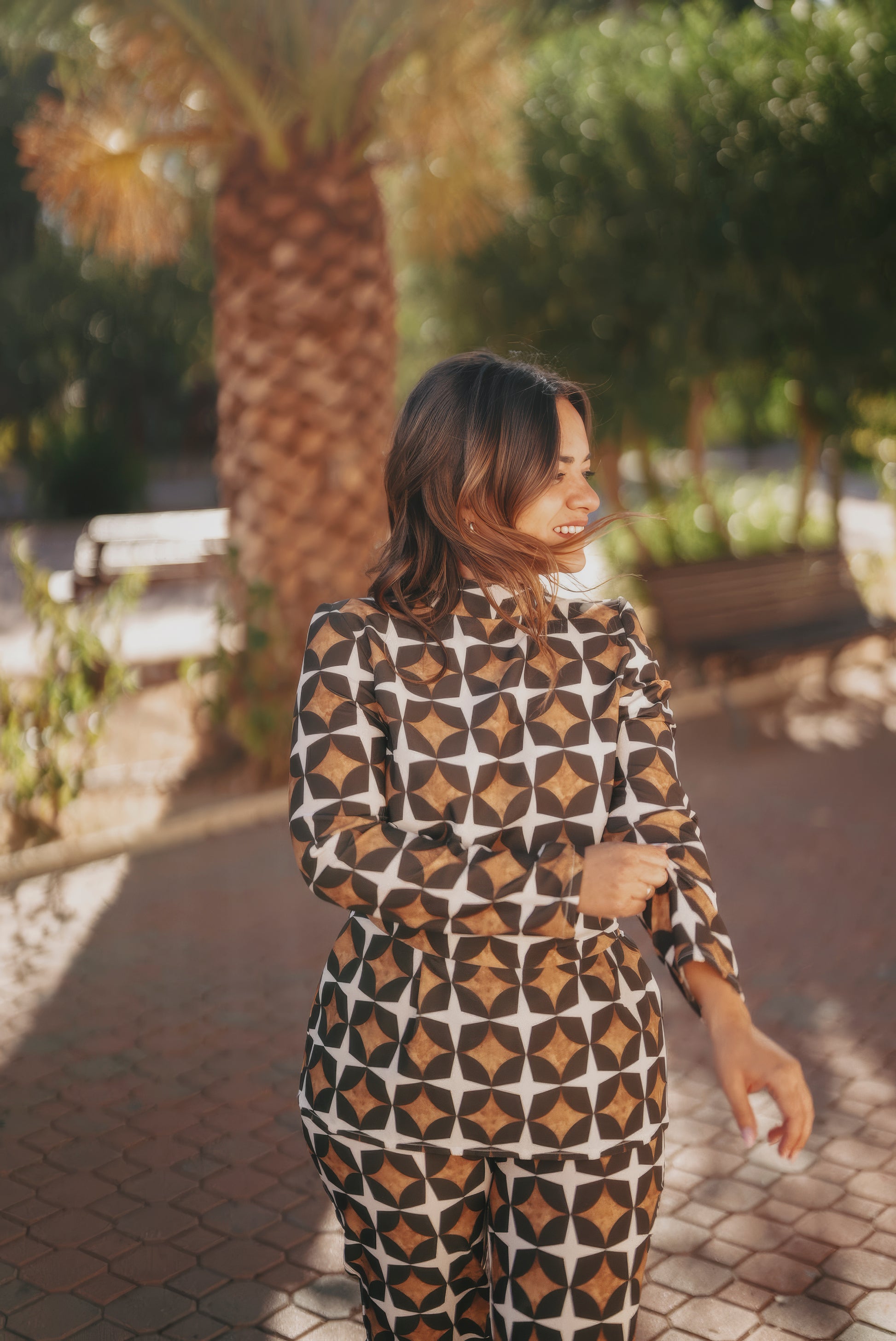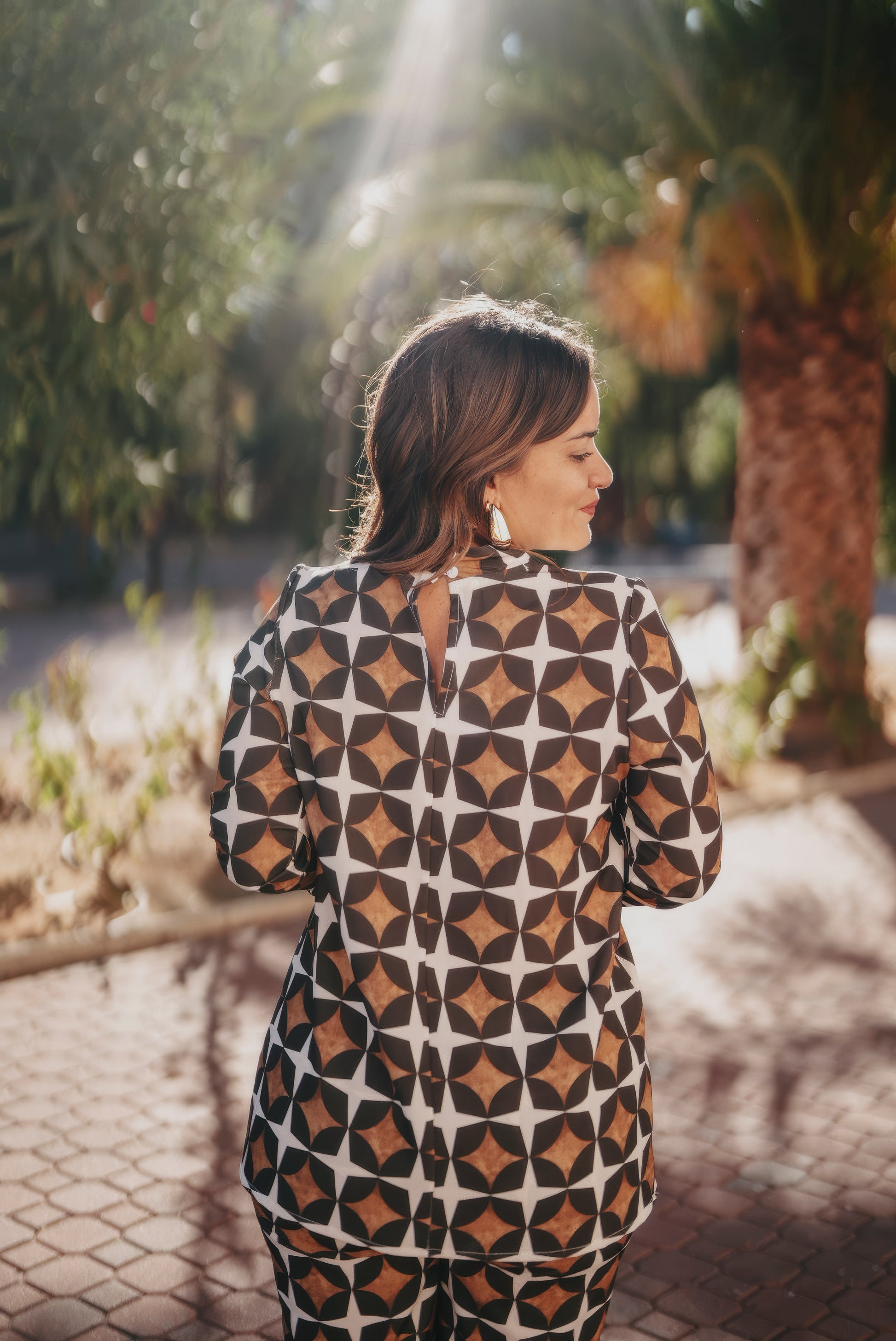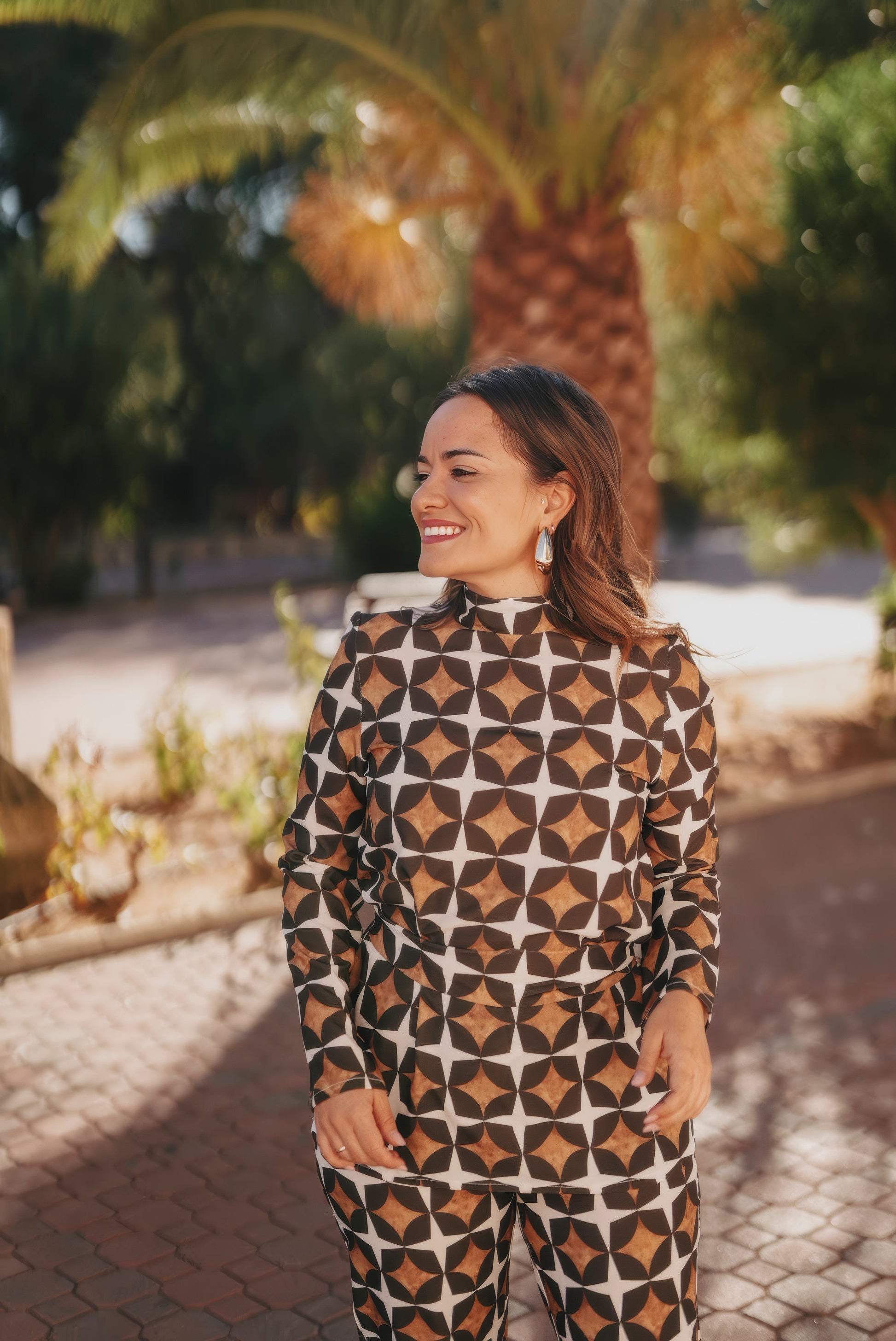 Blusa con estampado geométrico de manga larga y cuello perkins. Lleva cinturón