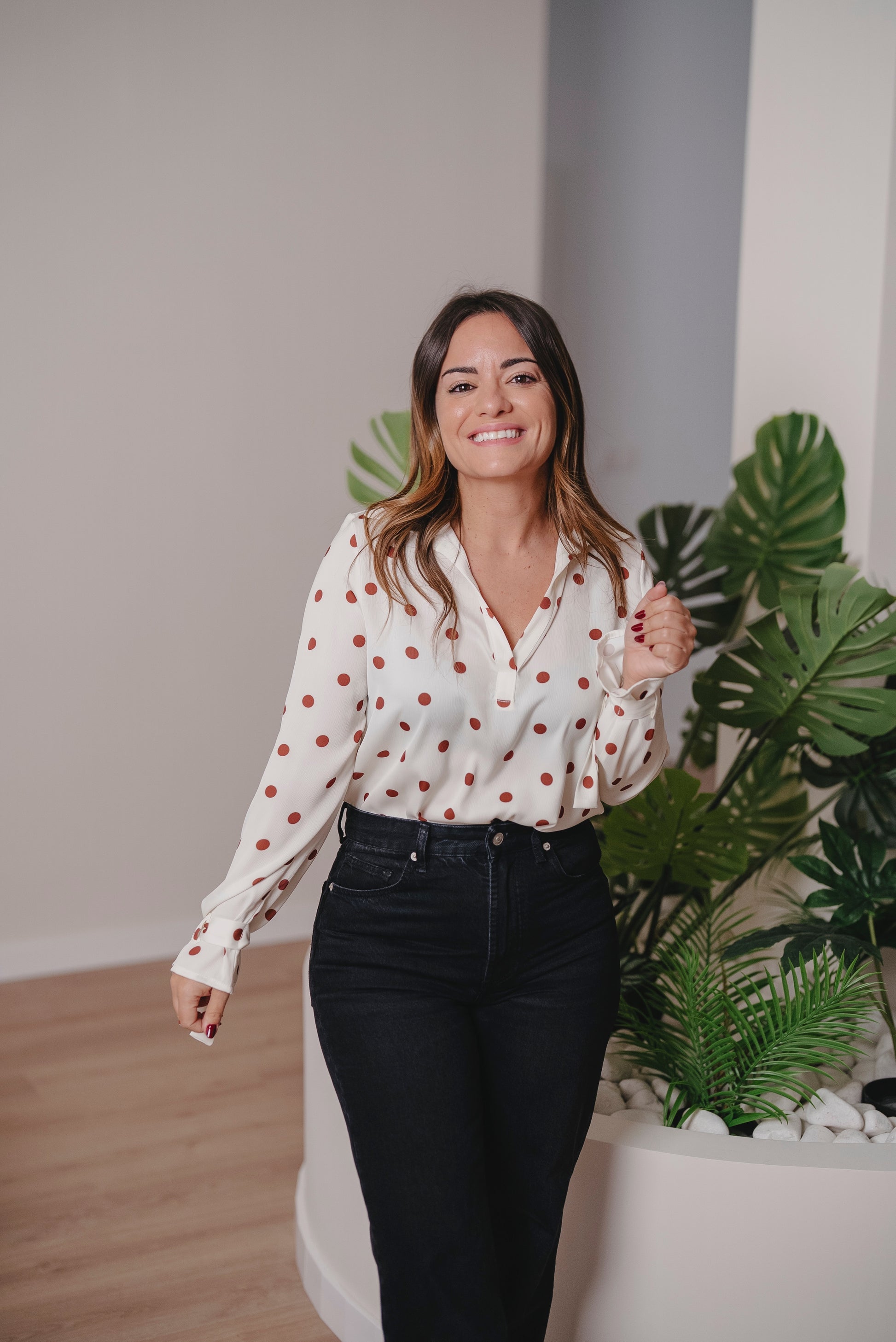 Camisa manga larga de estampado lunares, de corte recto y amplio con escote en pico con tapeta y un tejido muy gustoso.