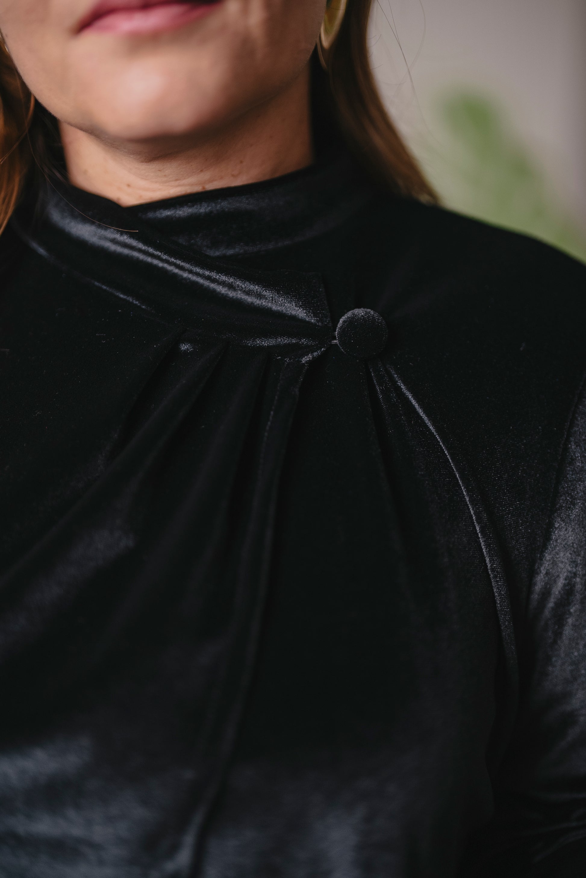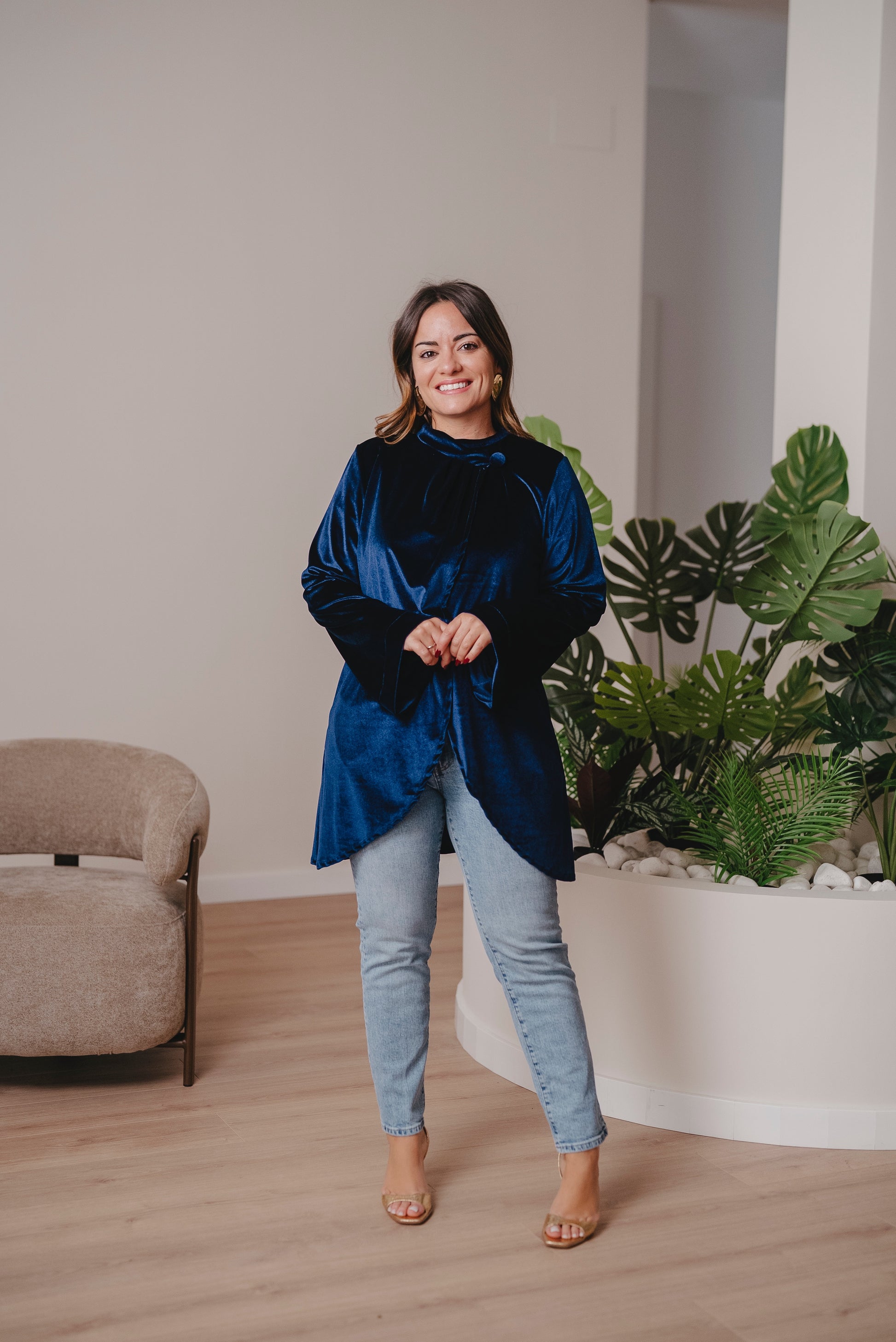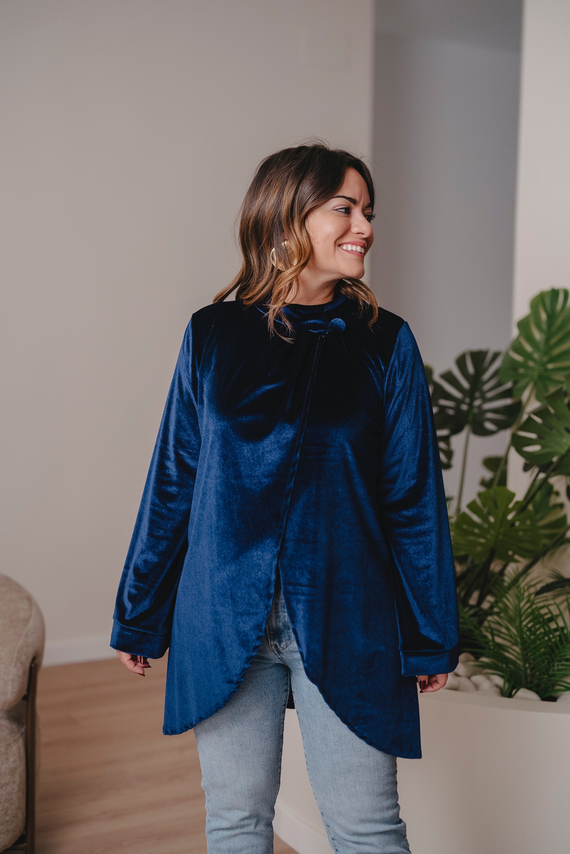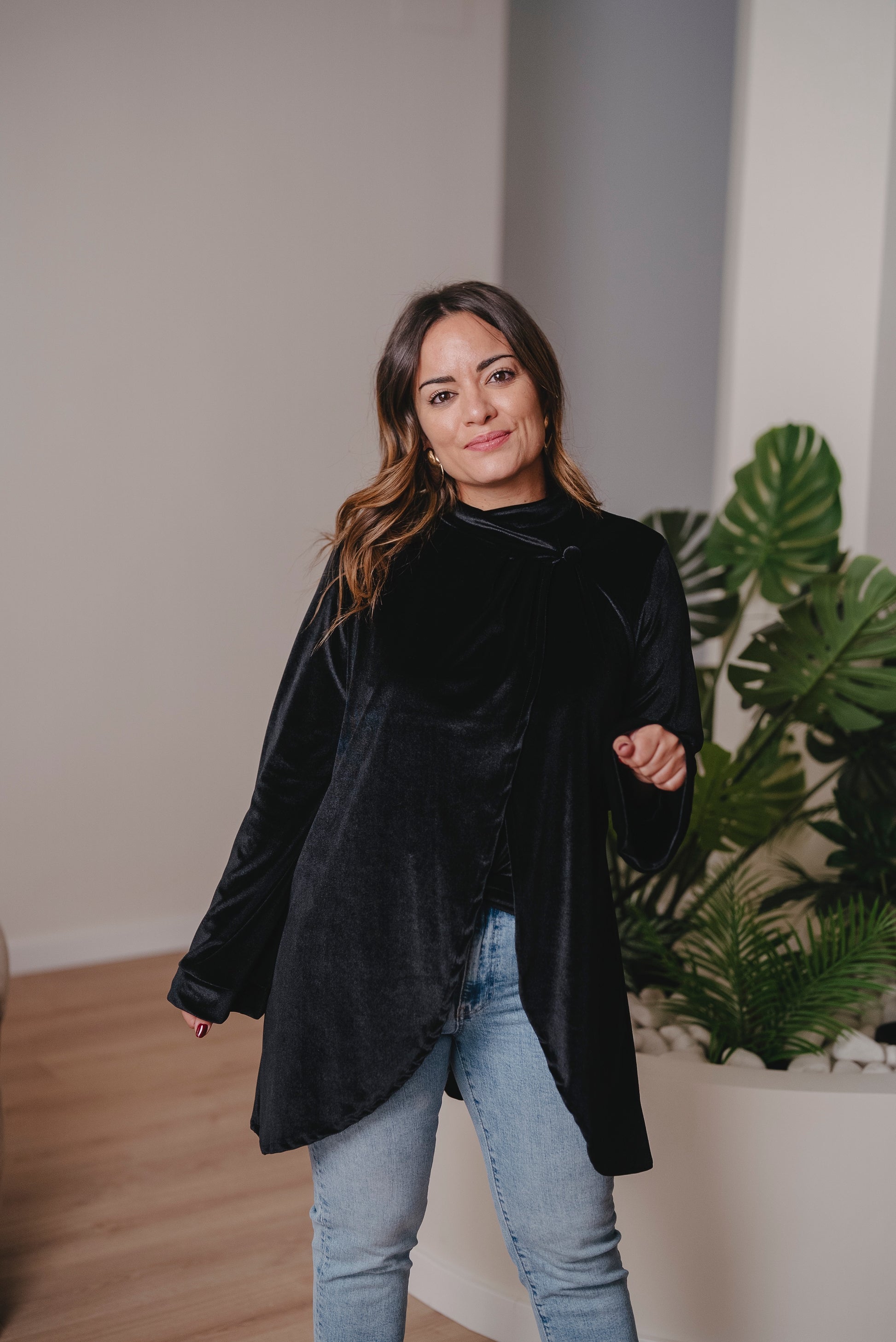 Capa de manga larga acampanada. Con botón interno para cerrar y externo para montar. Tiene un corte muy especial y asimétrico.