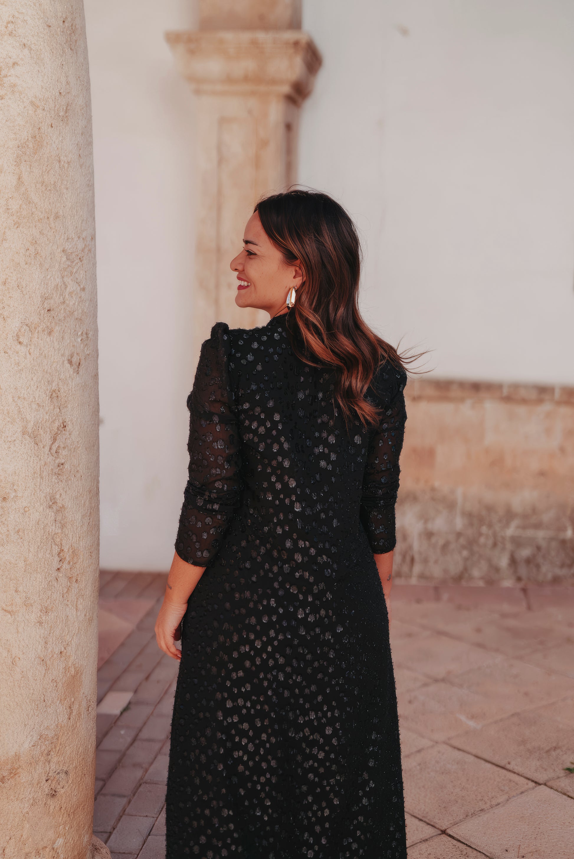 Capa de manga larga semitransparente, hombro abullonado ,lazada en el cuello y botones de nácar natural, que permite llevarlo cerrado o abierto, tiene detalles de circulitos en el tejido con una ligera purpurina.