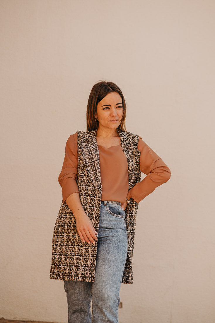 Chaleco con tejido de tweed con forro y sin bolsillos.
