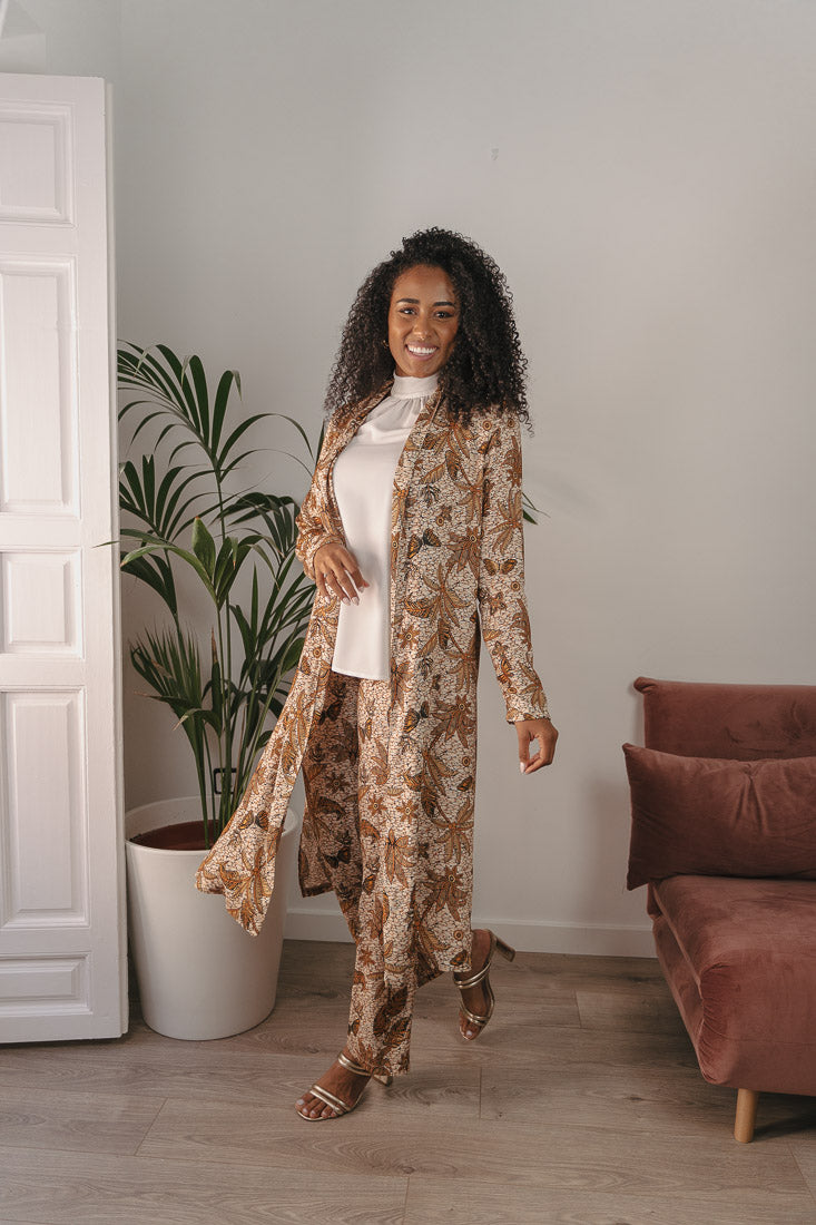 Conjunto en estampado en tonos marrones de casaca larga con aberturas a los lados y cinturón. Para poder llevarla abierta a cerrada.