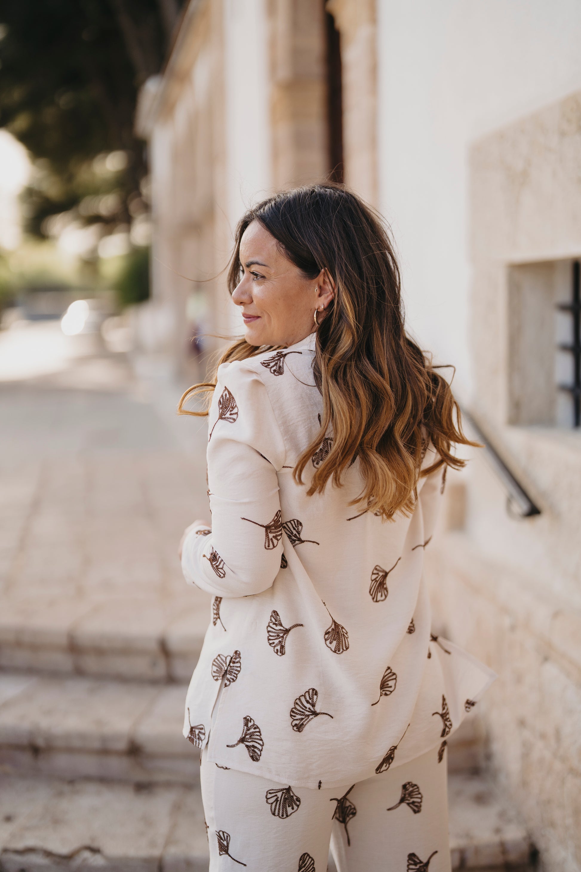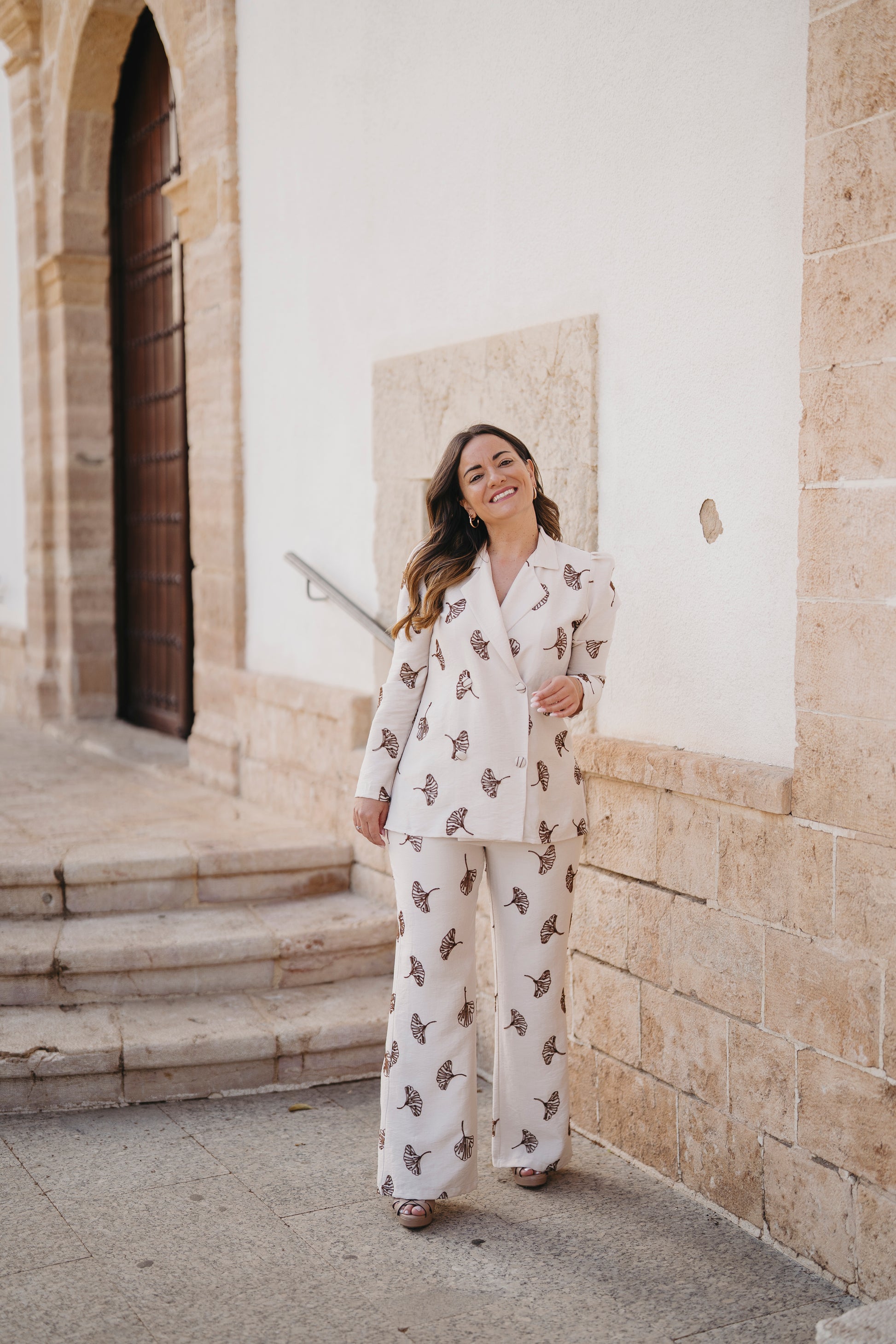 Conjunto de casaca y pantalón con cinturilla de goma, en estampado beige con detalle de flores bordadas en color marrón.
