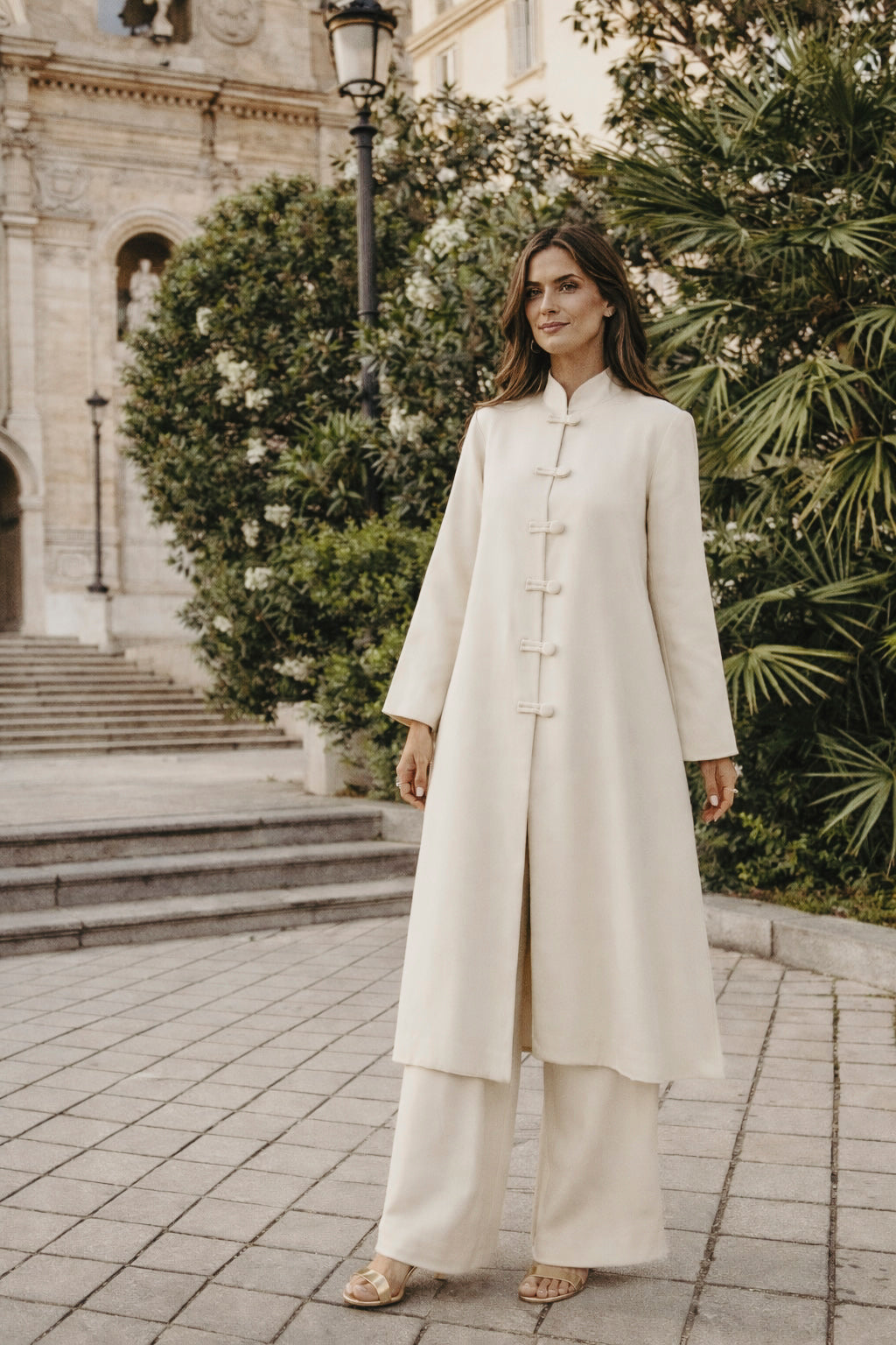 Conjunto compuesto por abrigo tipo casaca largo, con un tejido ligero y fluido, cuello mao , aberturas laterales y cierre frontal con presillas en el mismo tejido. Es recto y con manga larga y acampanada.