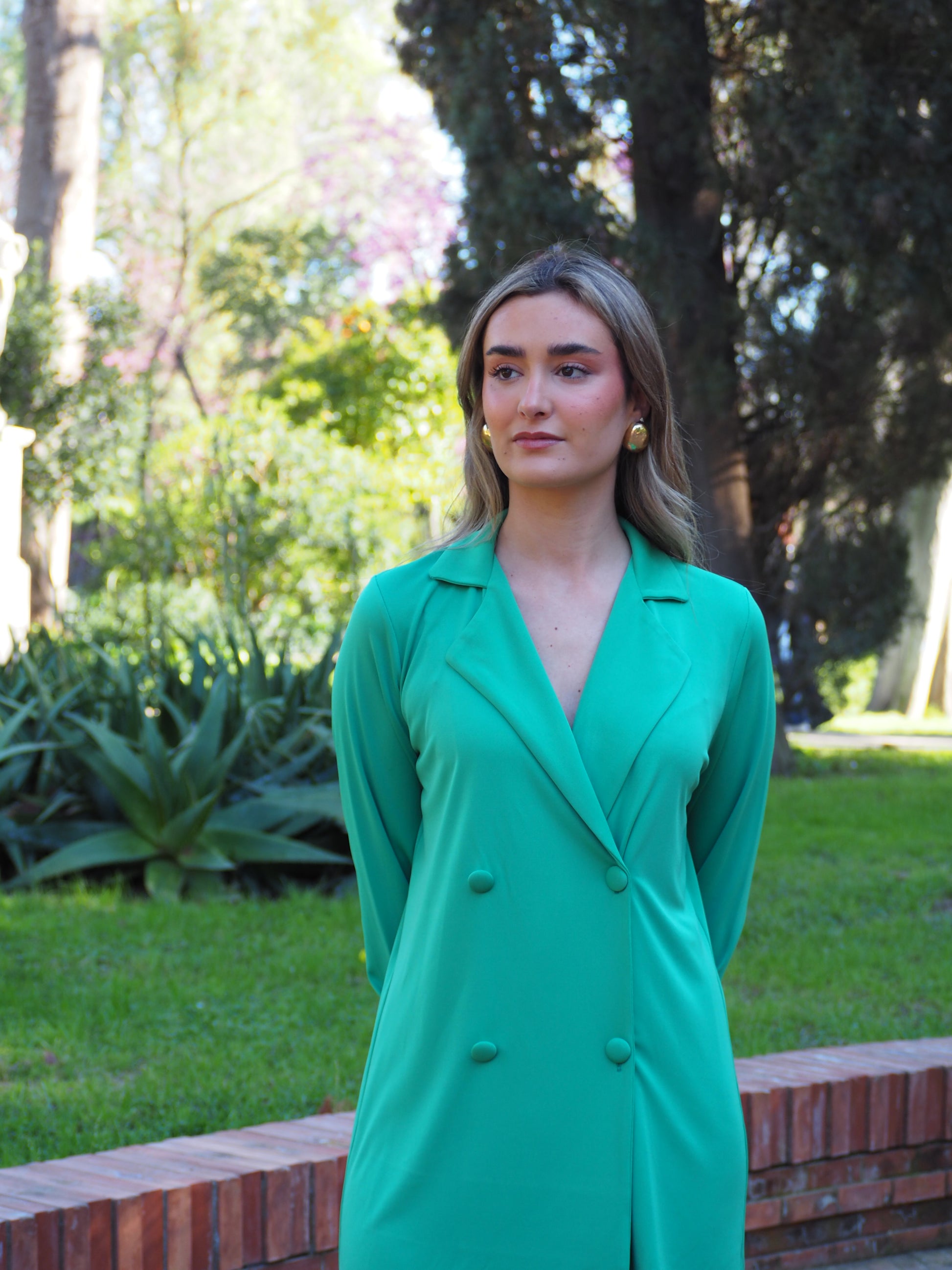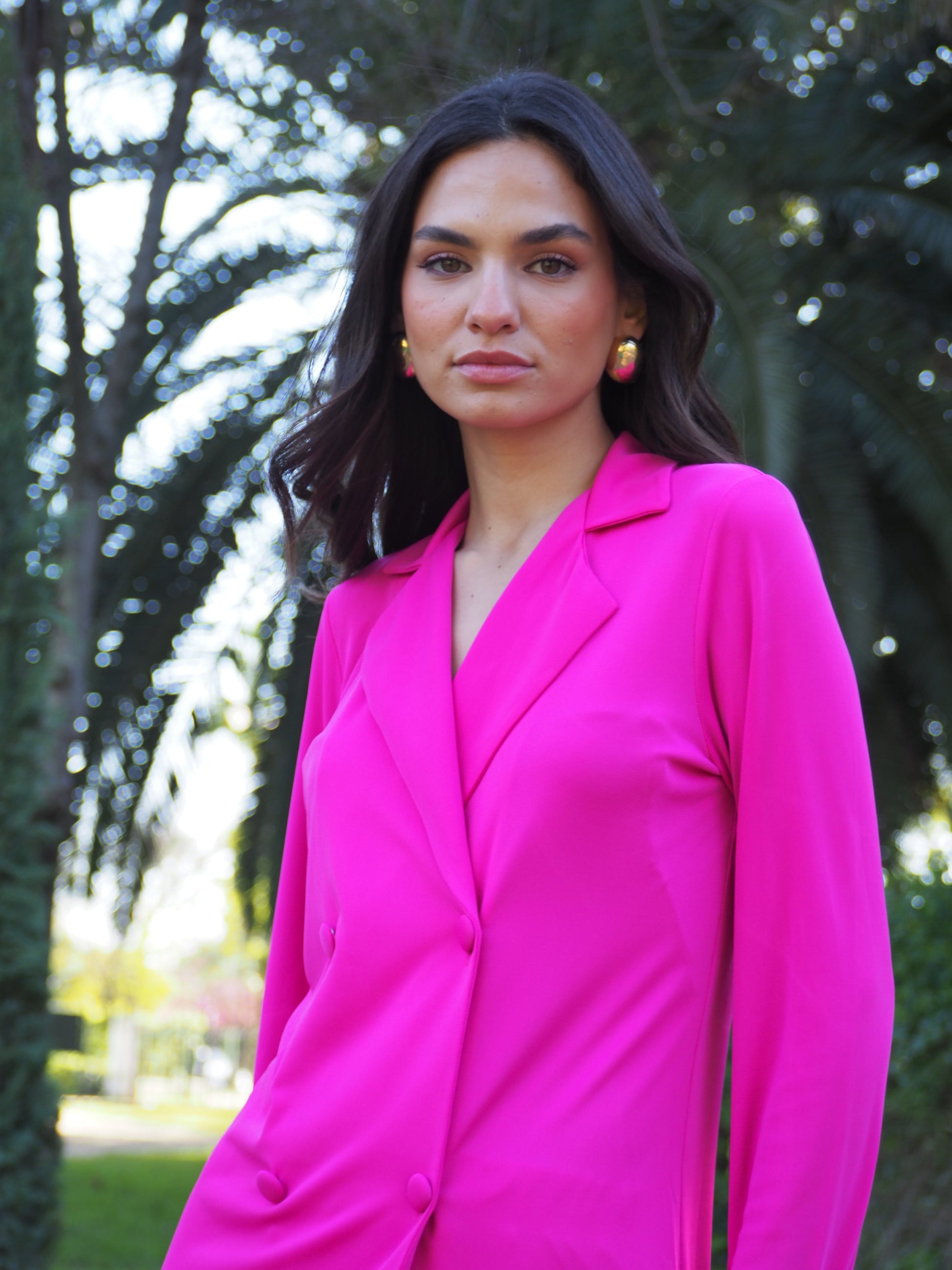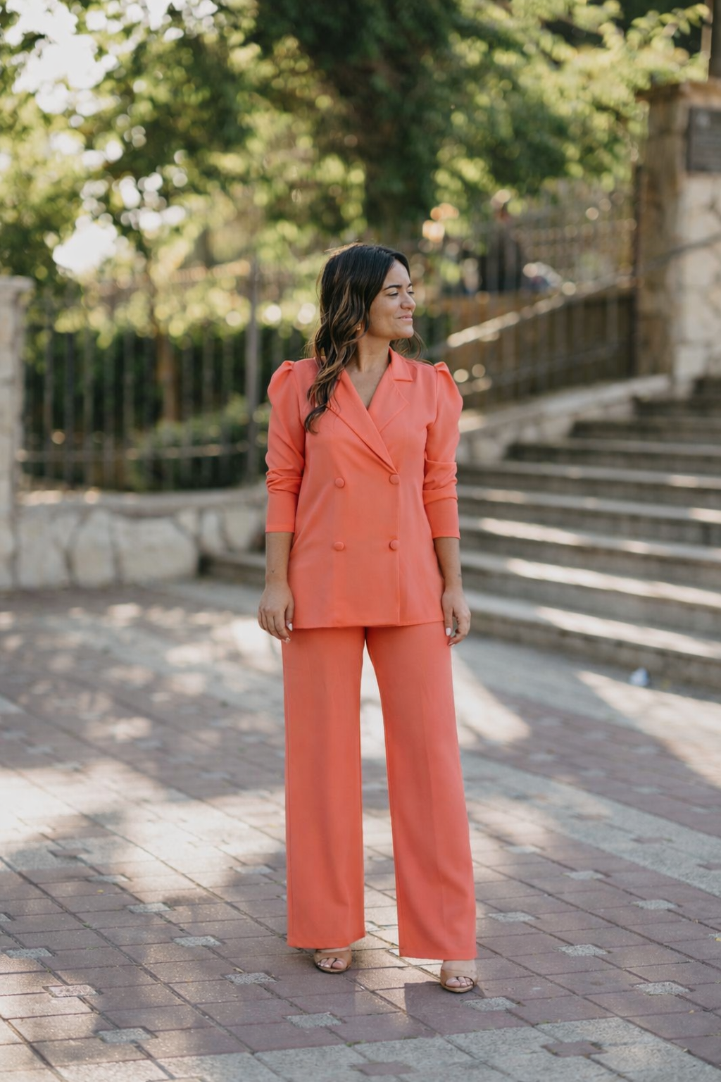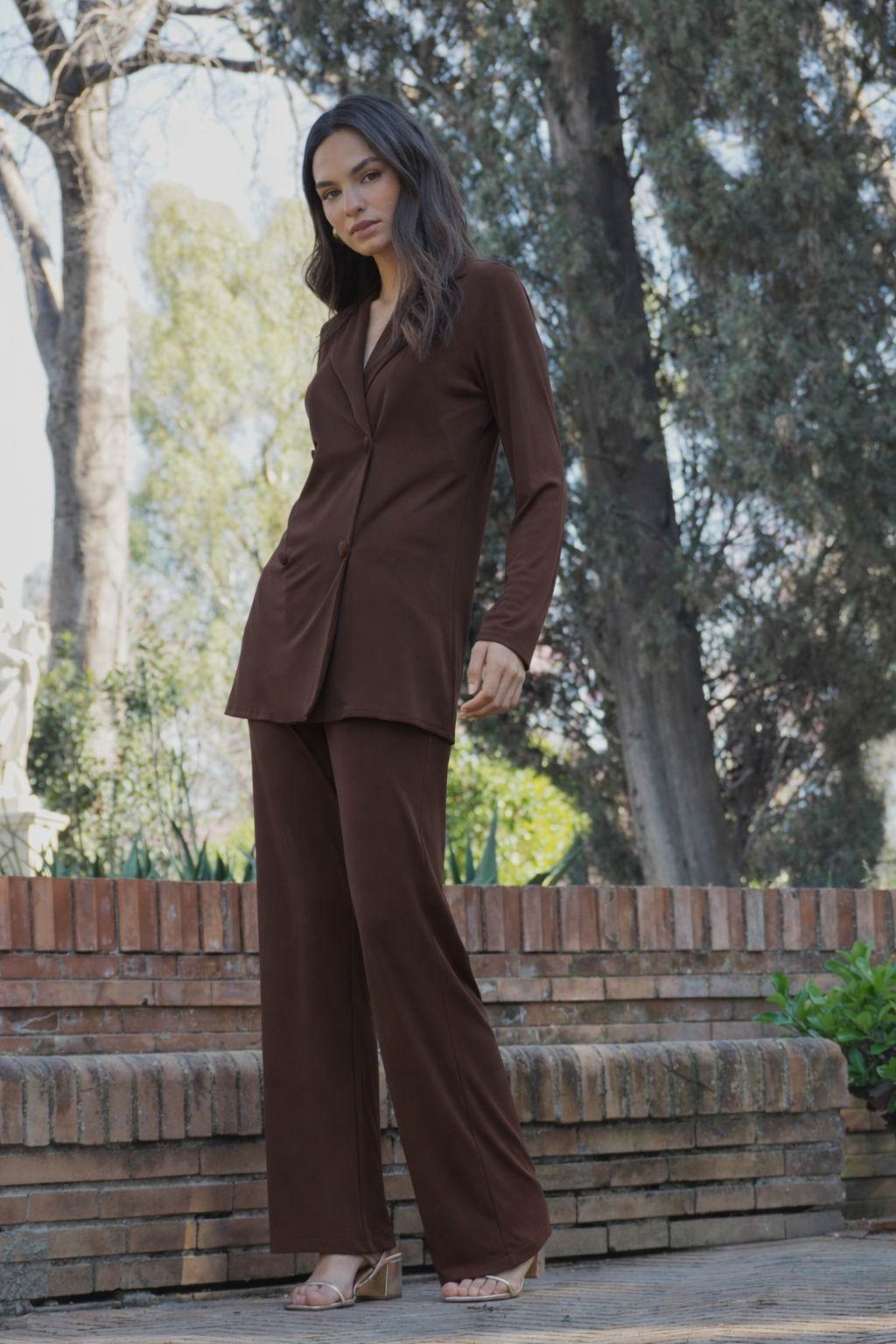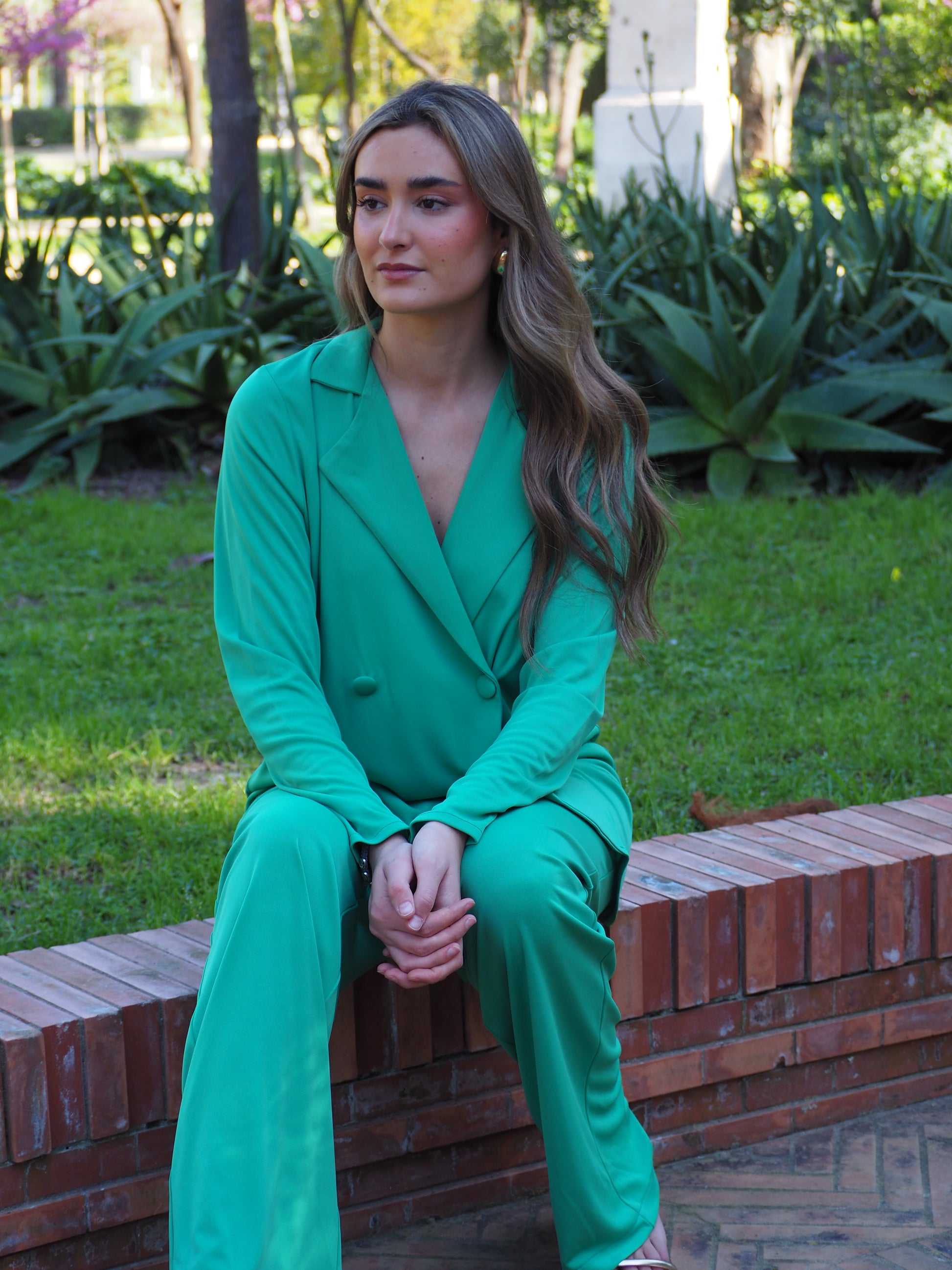Conjunto liso de casaca con cuello solapa y cuatro botones forrados grandes. El pantalón es con cinturilla de goma para que pueda adaptarse bien a la cintura.
