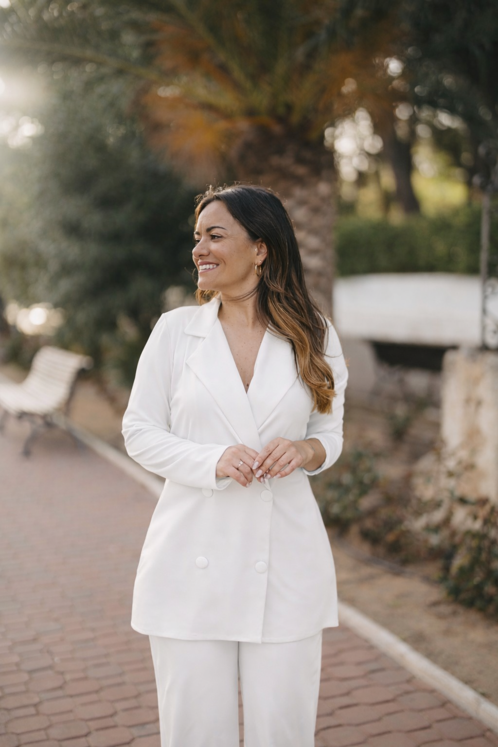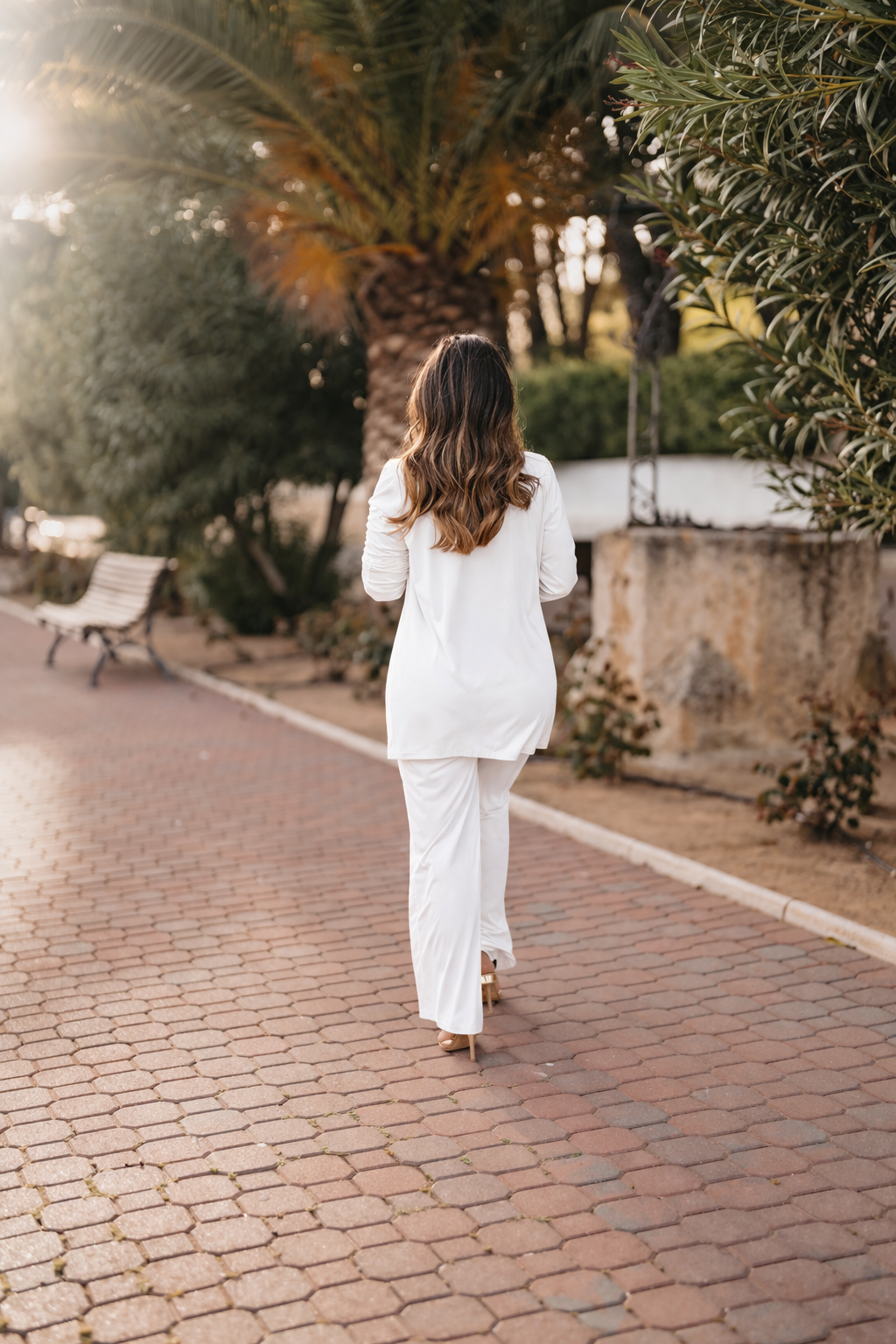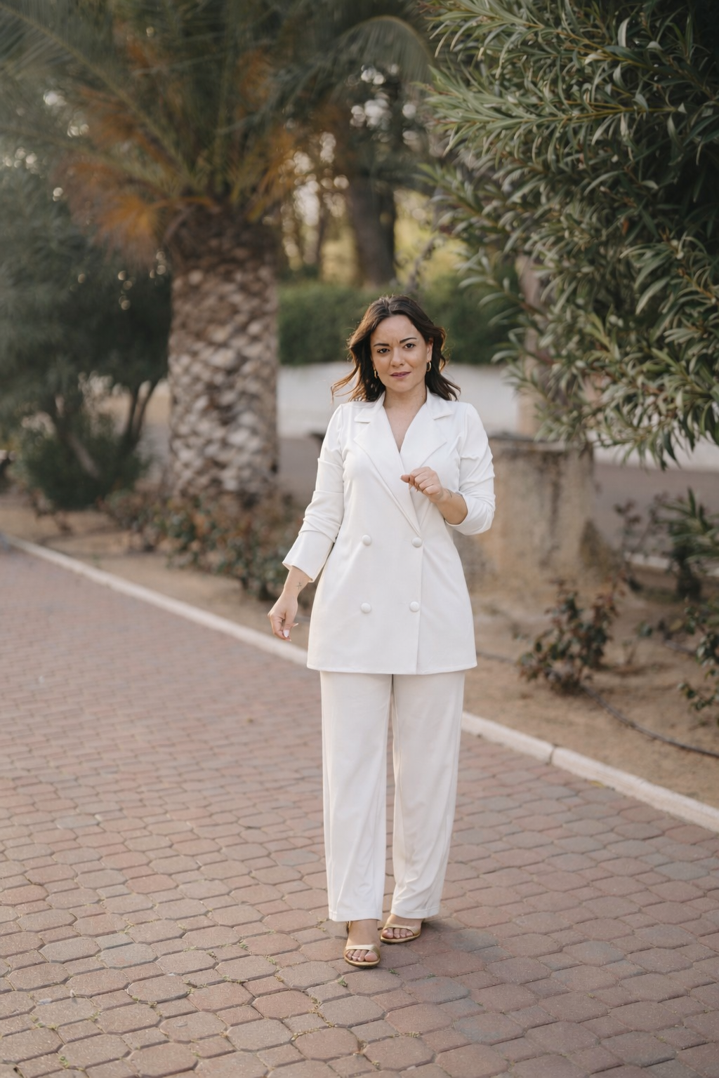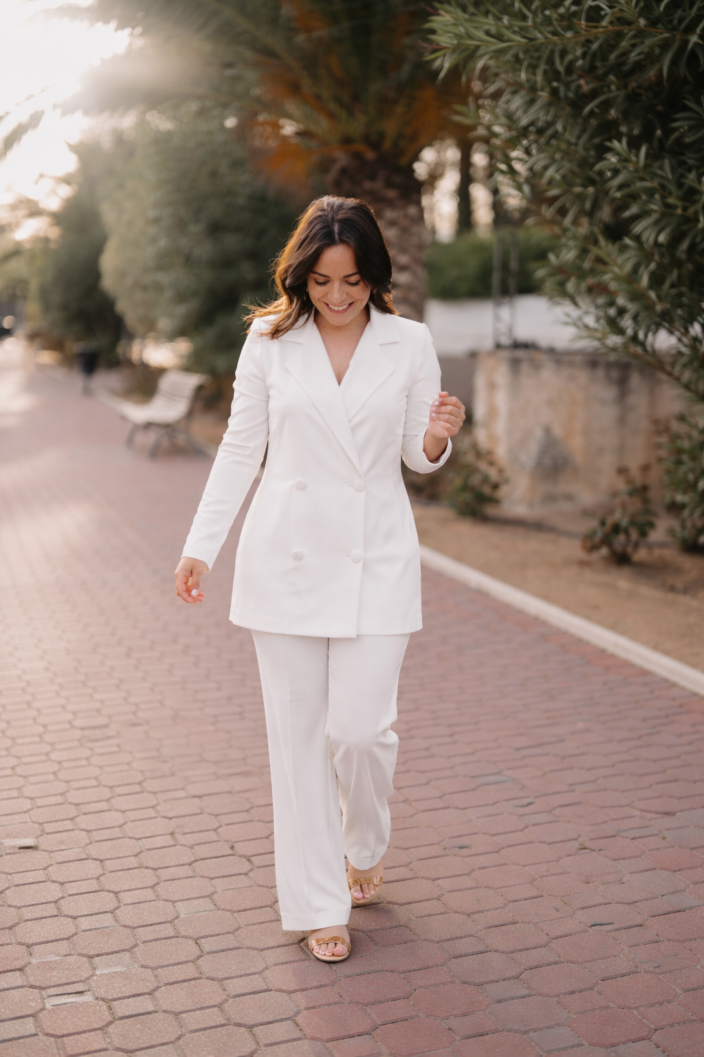 Conjunto liso de casaca con cuello solapa y cuatro botones forrados grandes. El pantalón es con cinturilla de goma para que pueda adaptarse bien a la cintura.