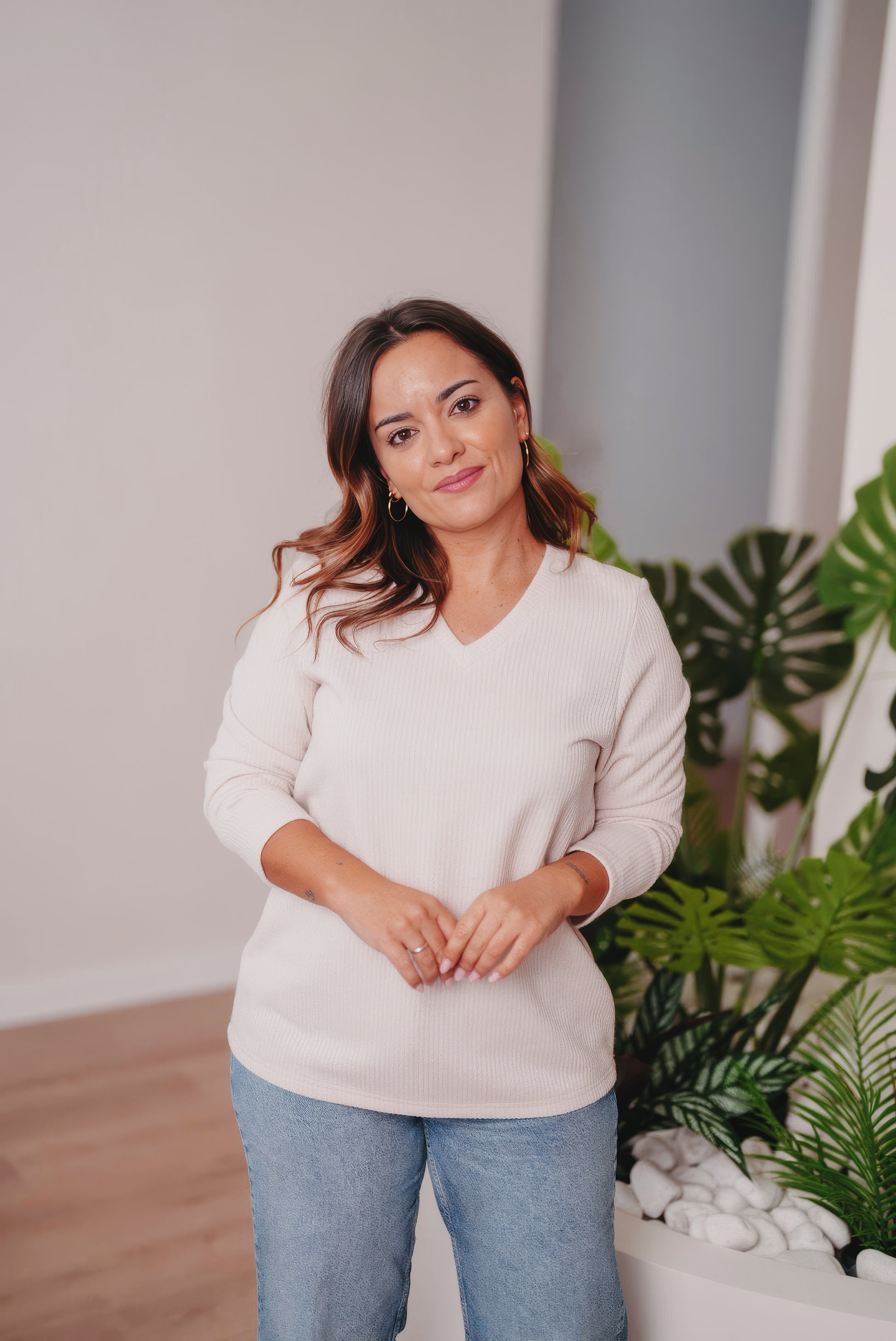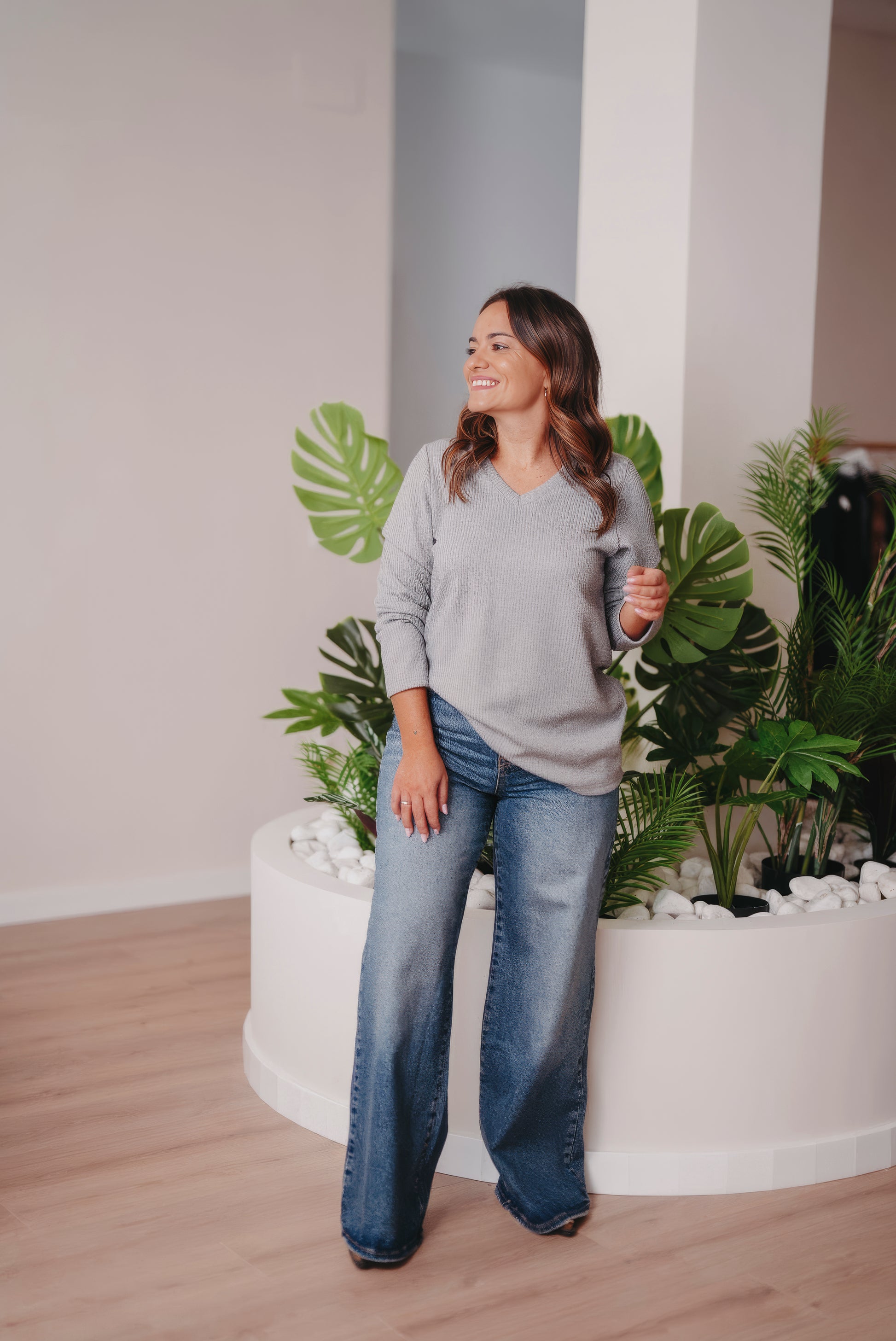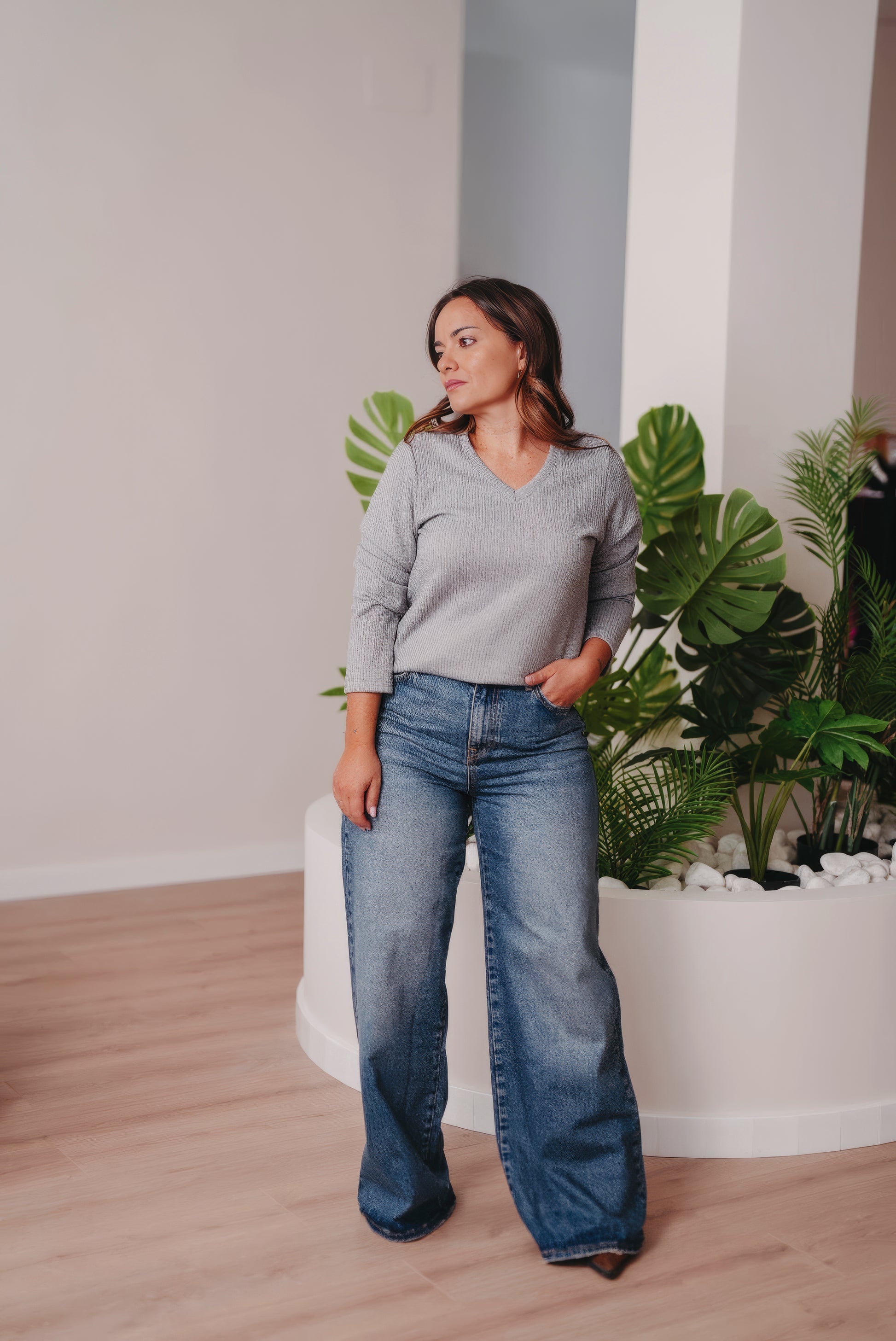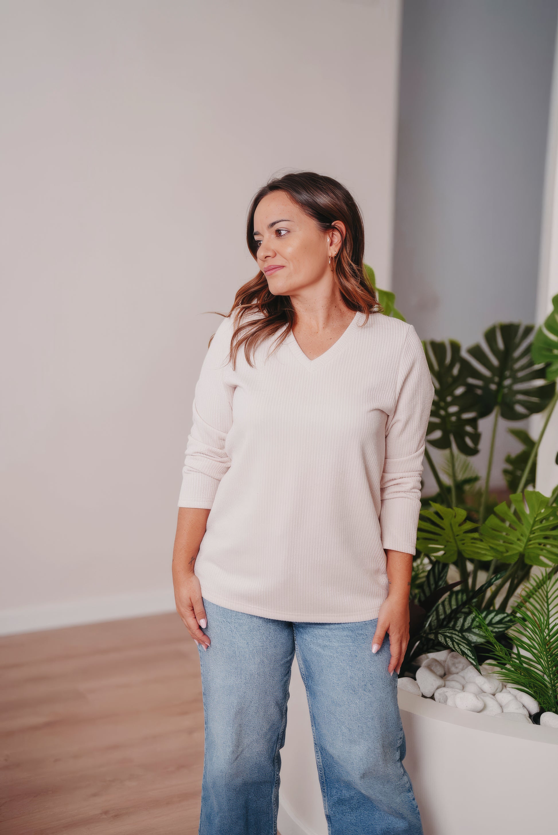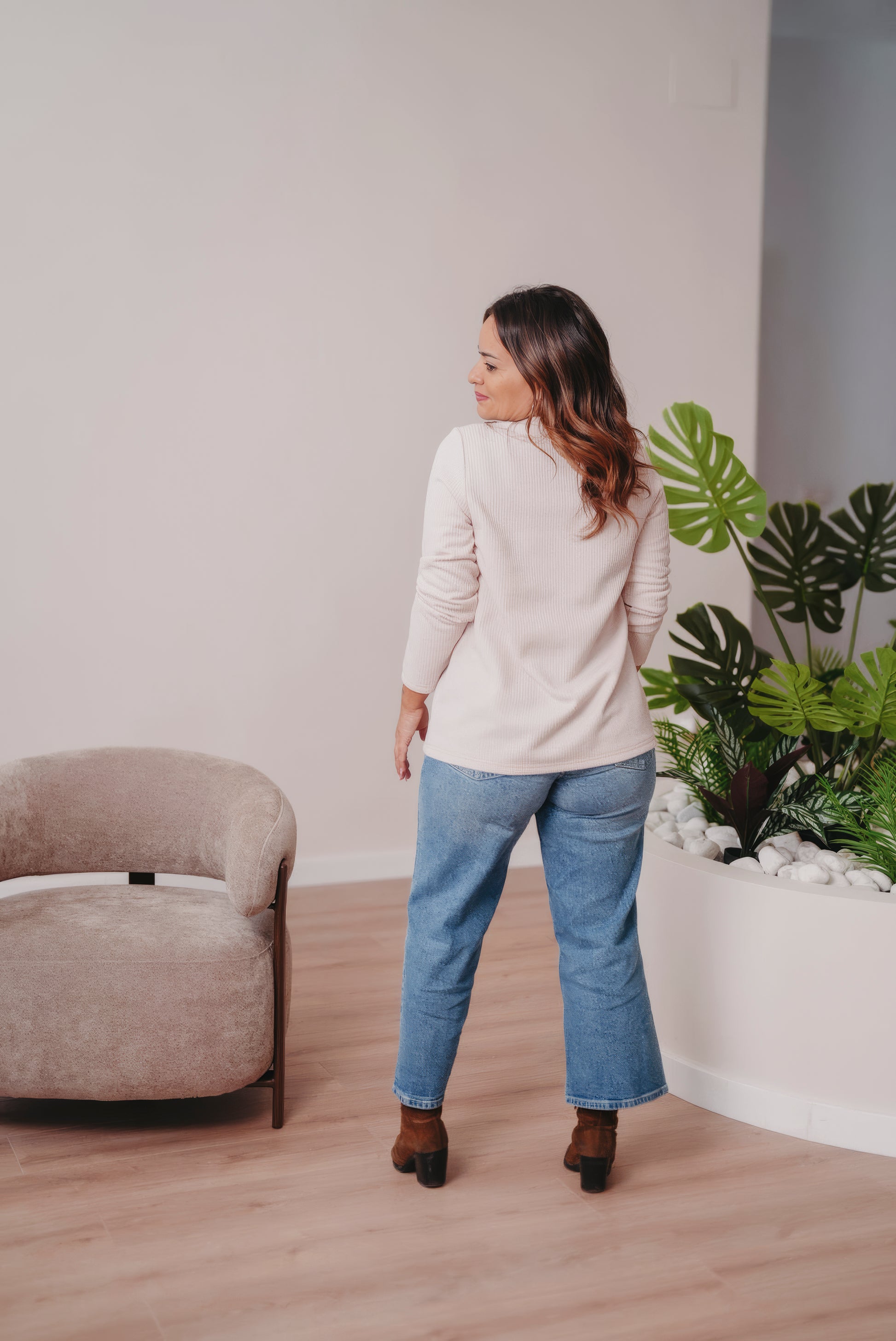 Jersey manga larga de punto canalé grueso, corte recto sin aberturas laterales.