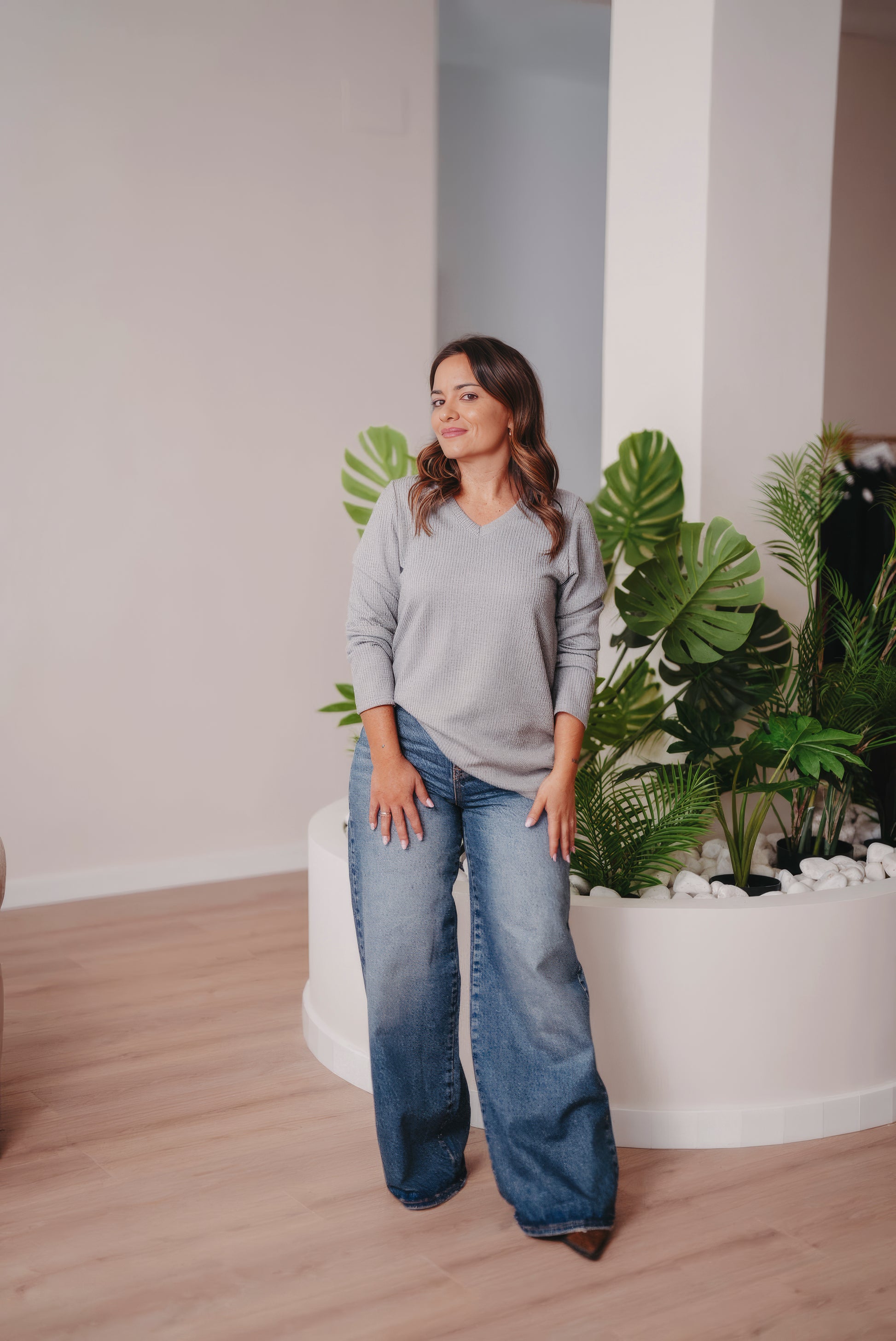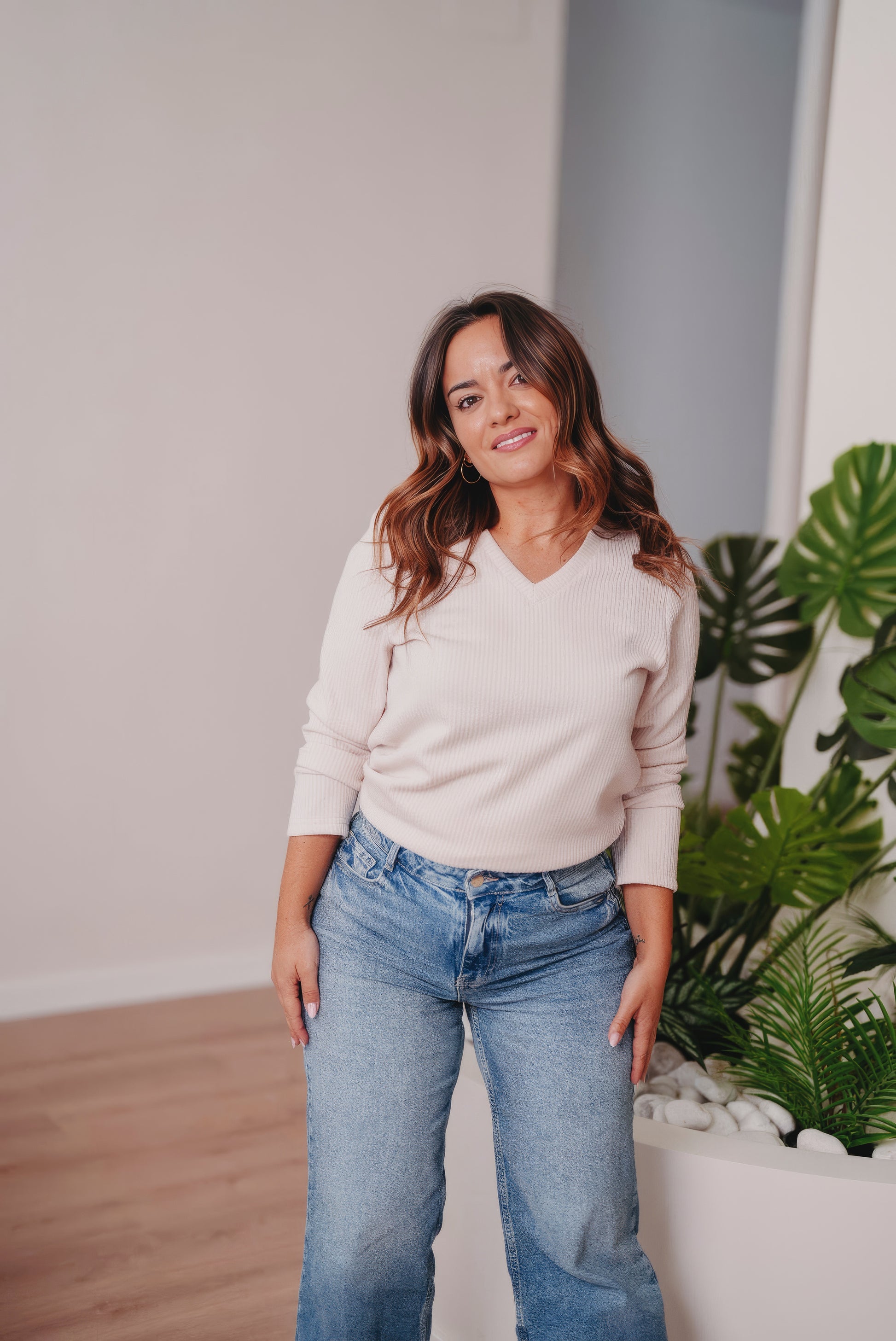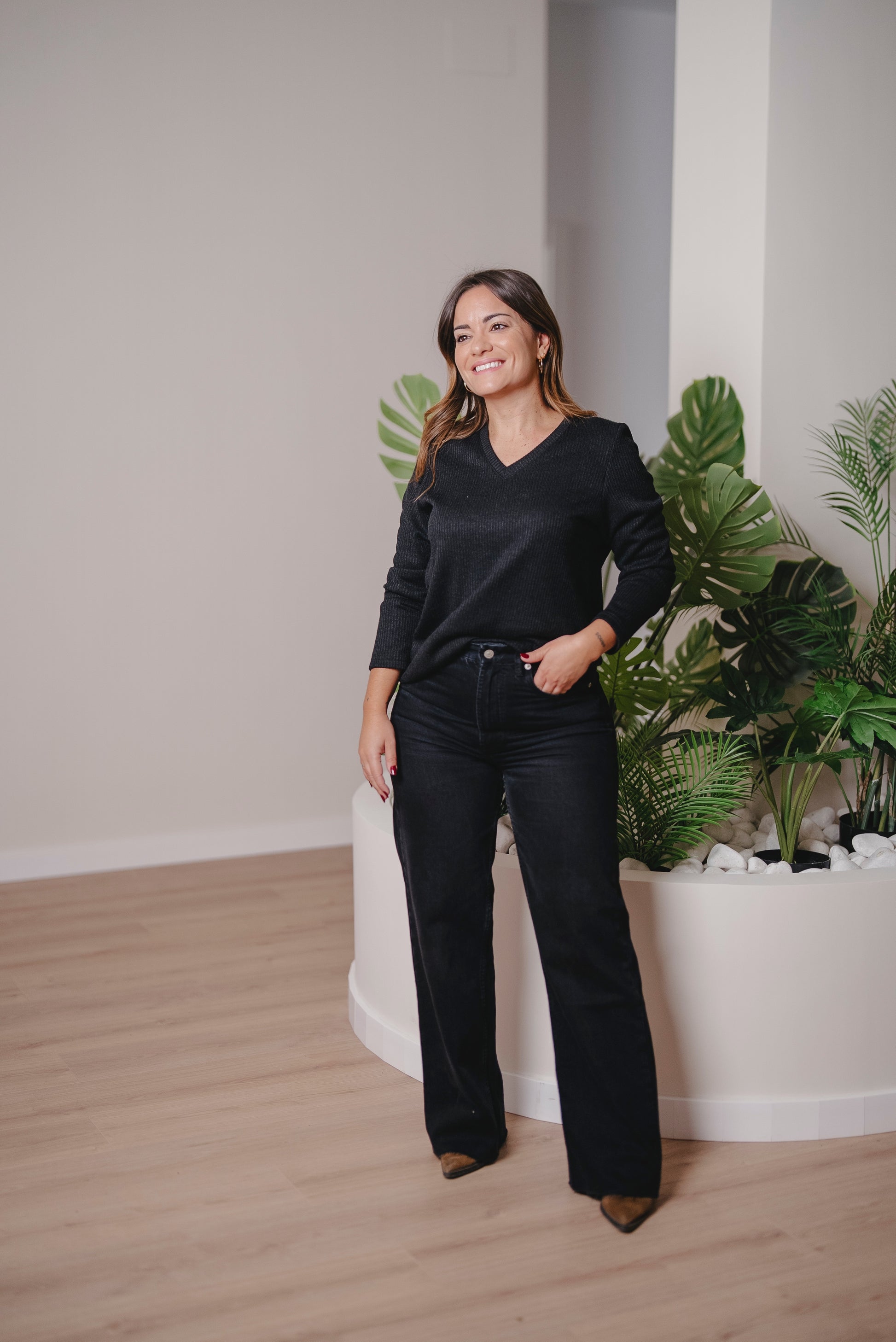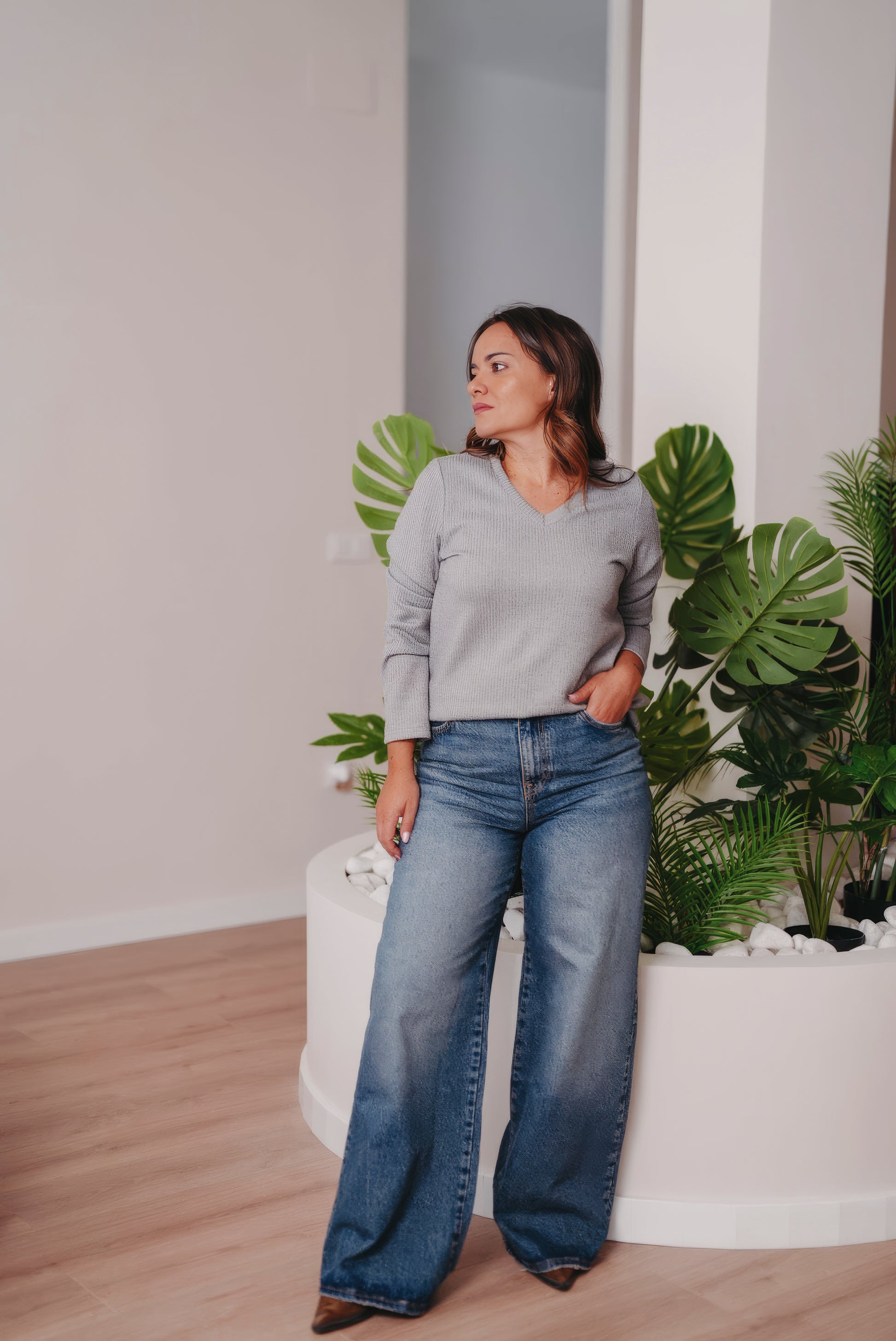 Jersey manga larga de punto canalé grueso, corte recto sin aberturas laterales.