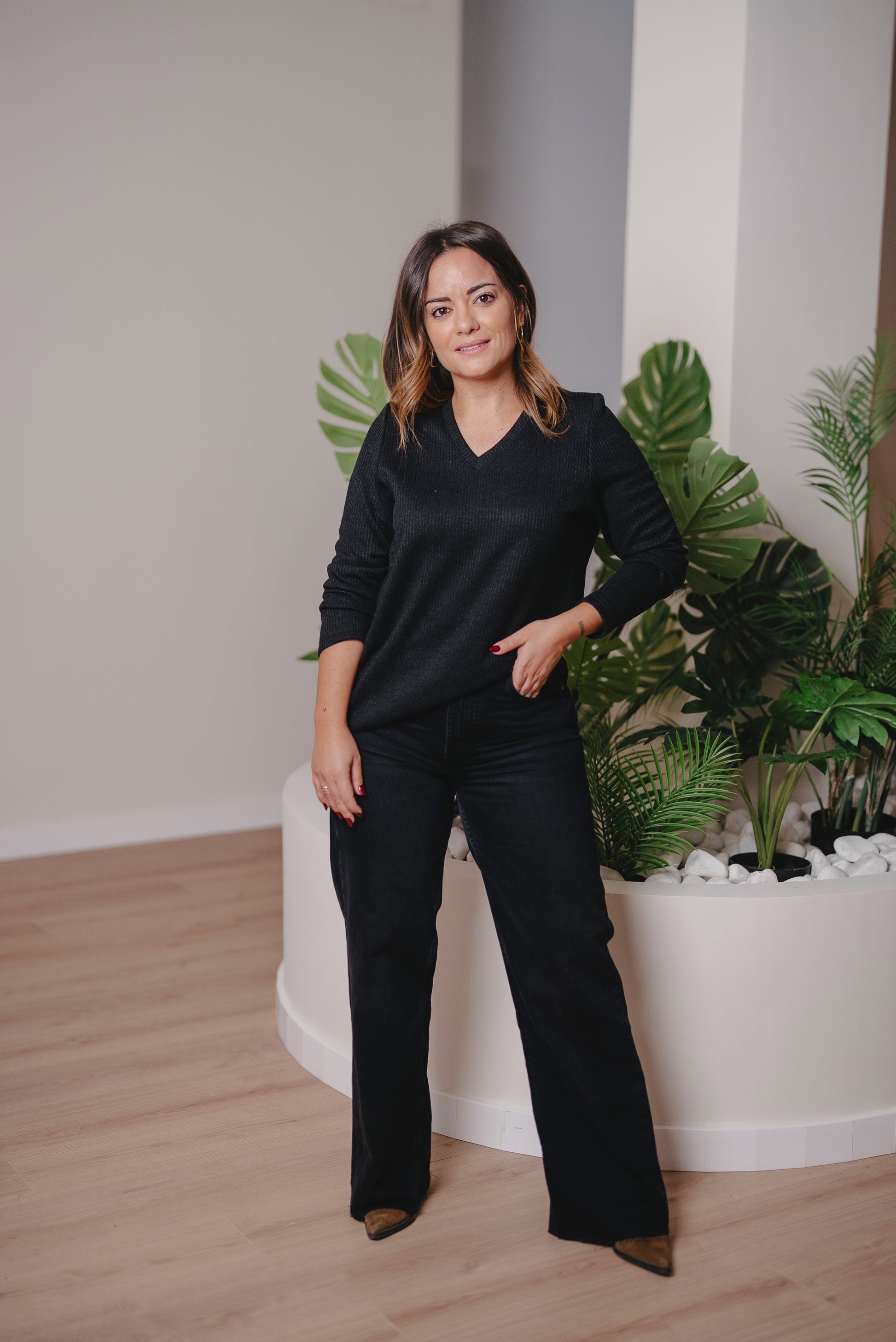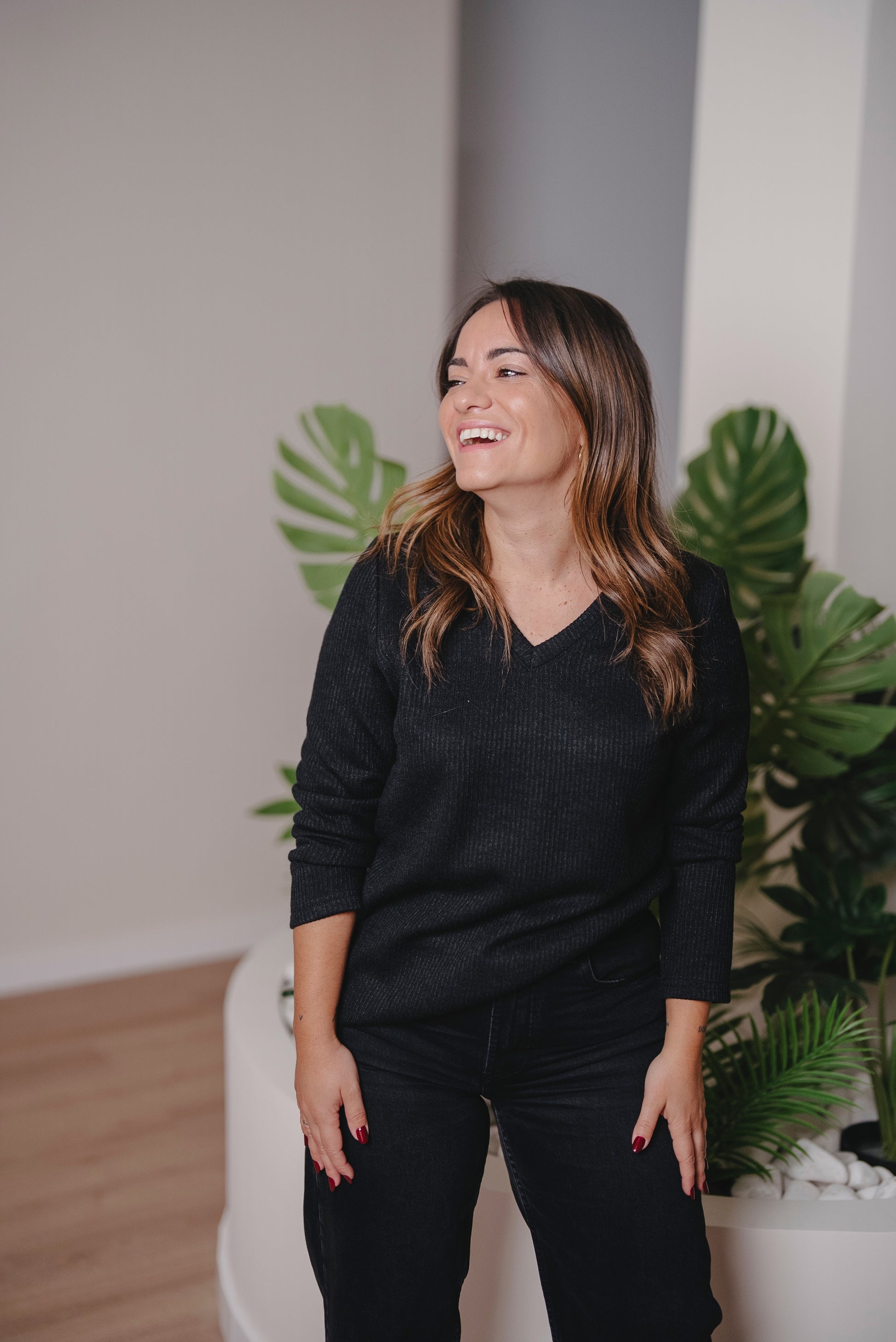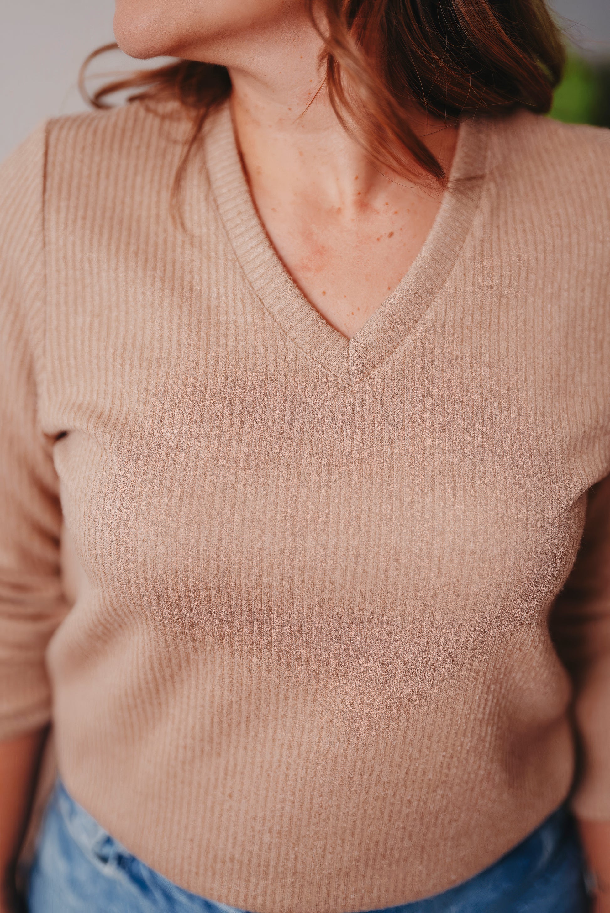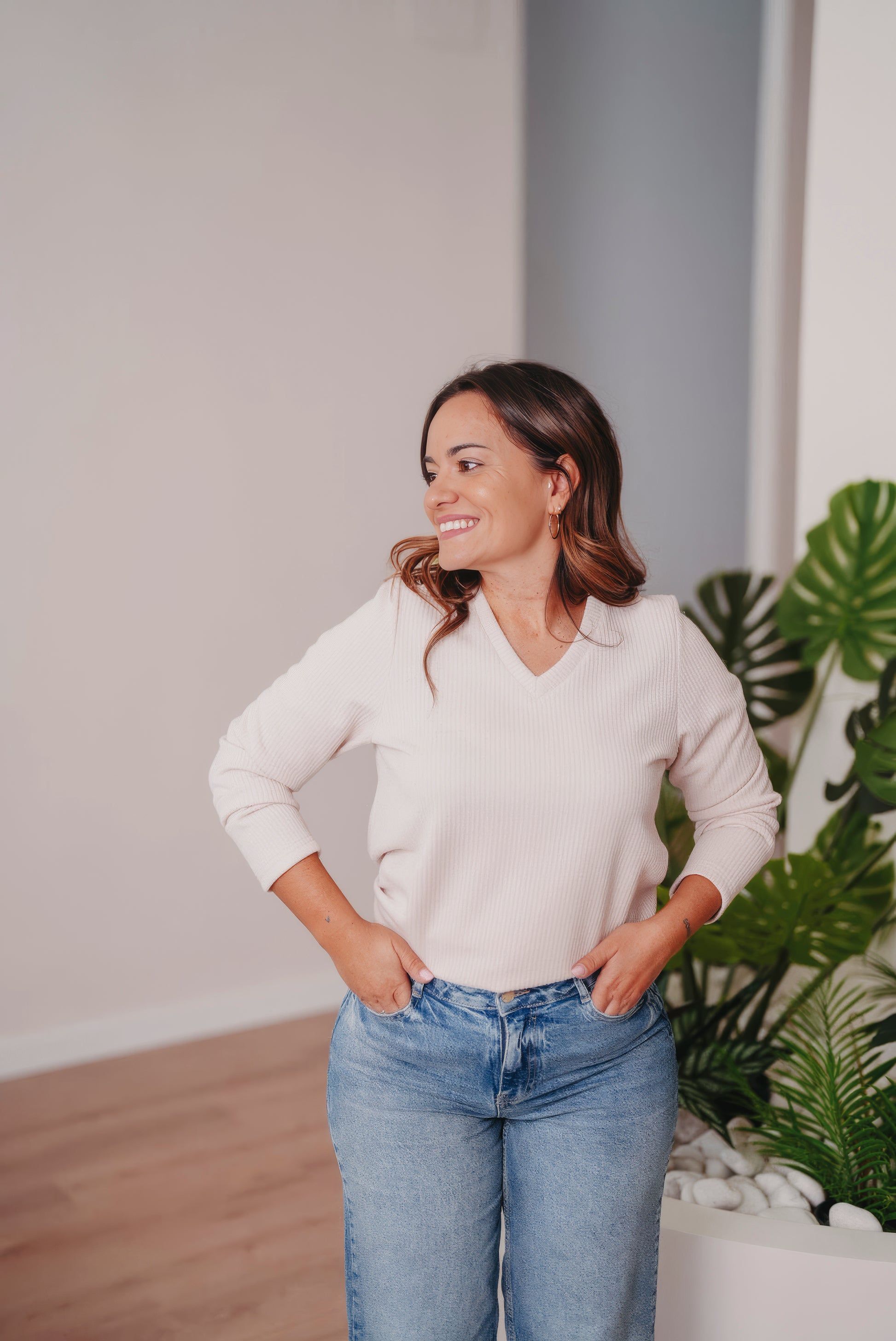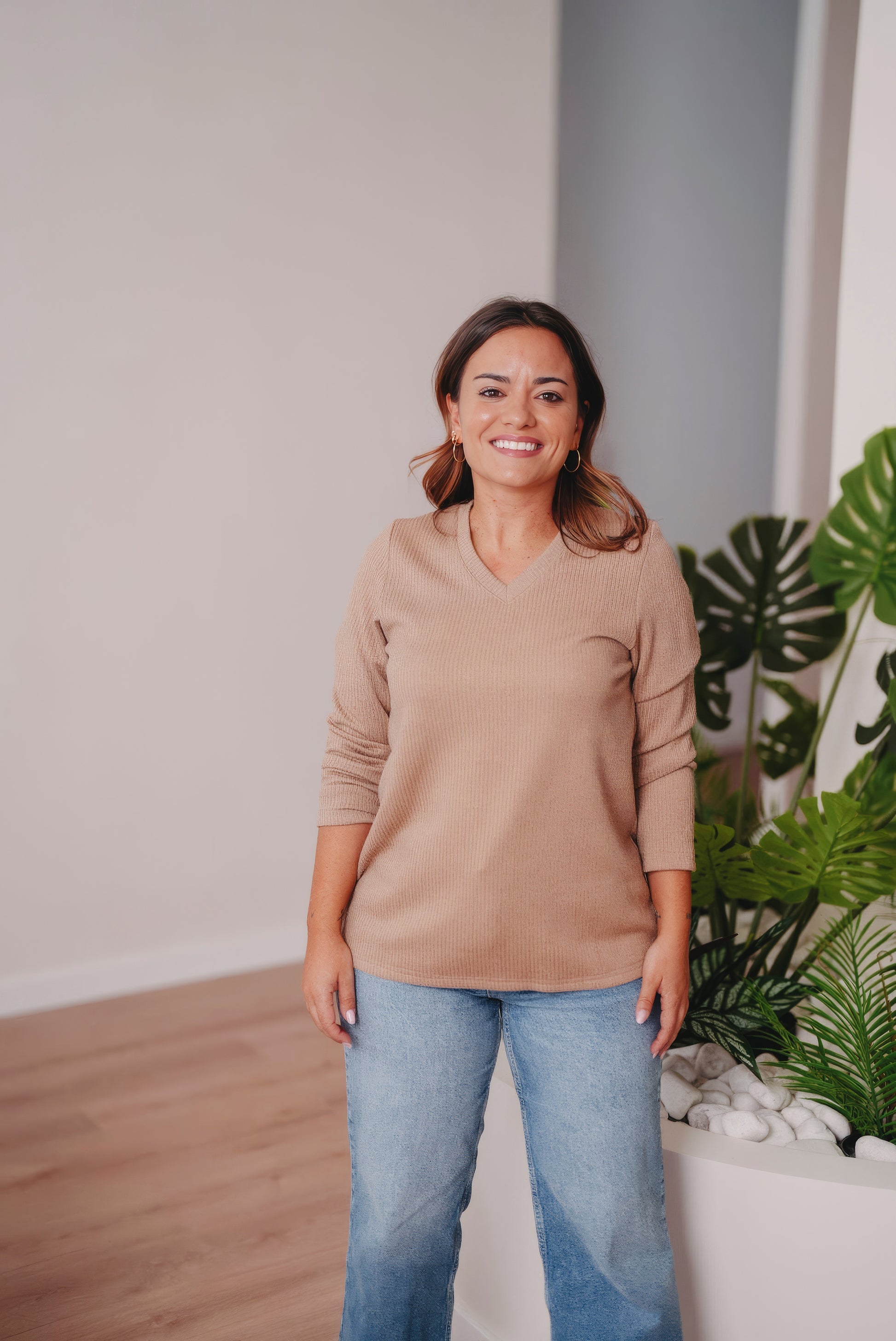 Jersey manga larga de punto canalé grueso, corte recto sin aberturas laterales.