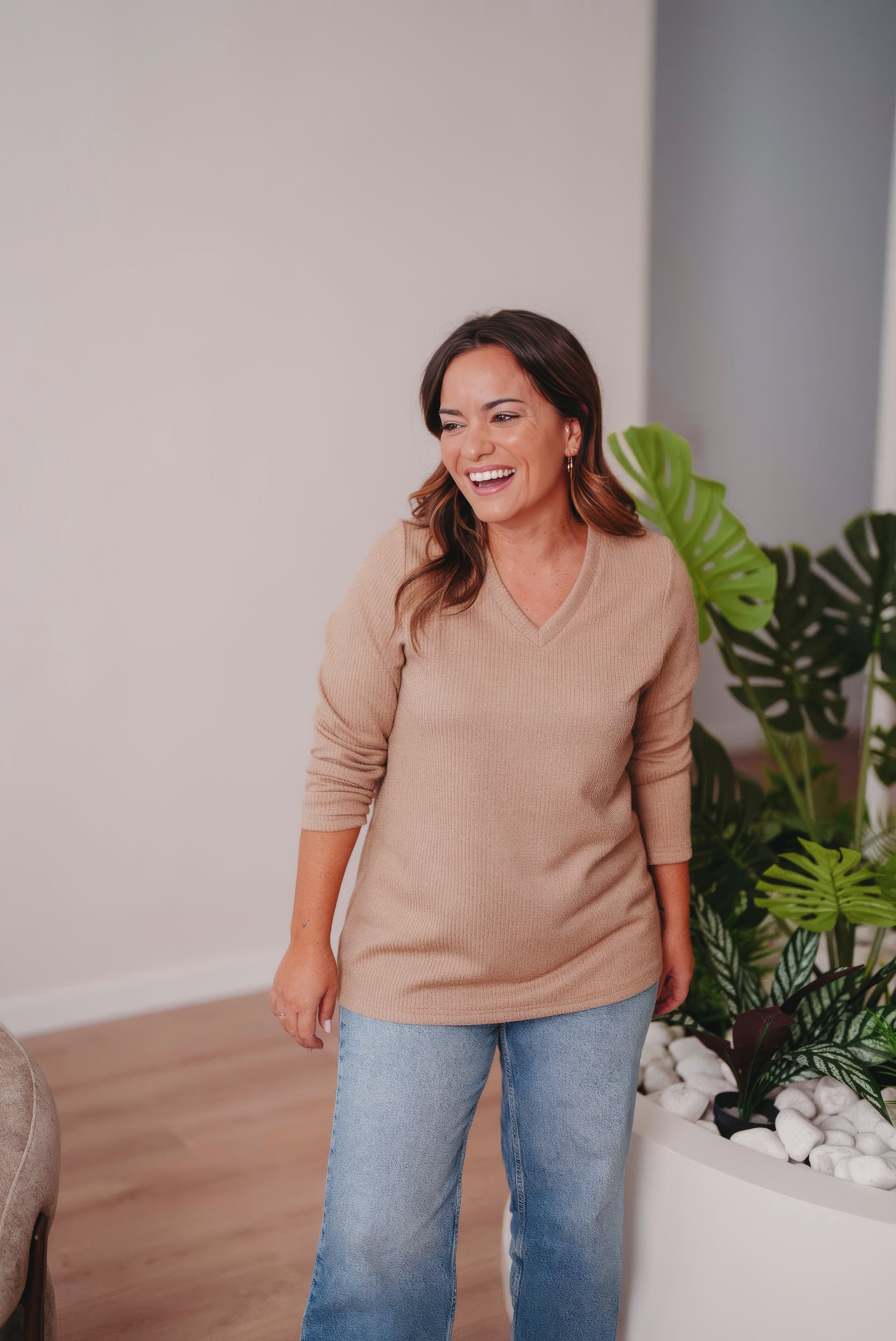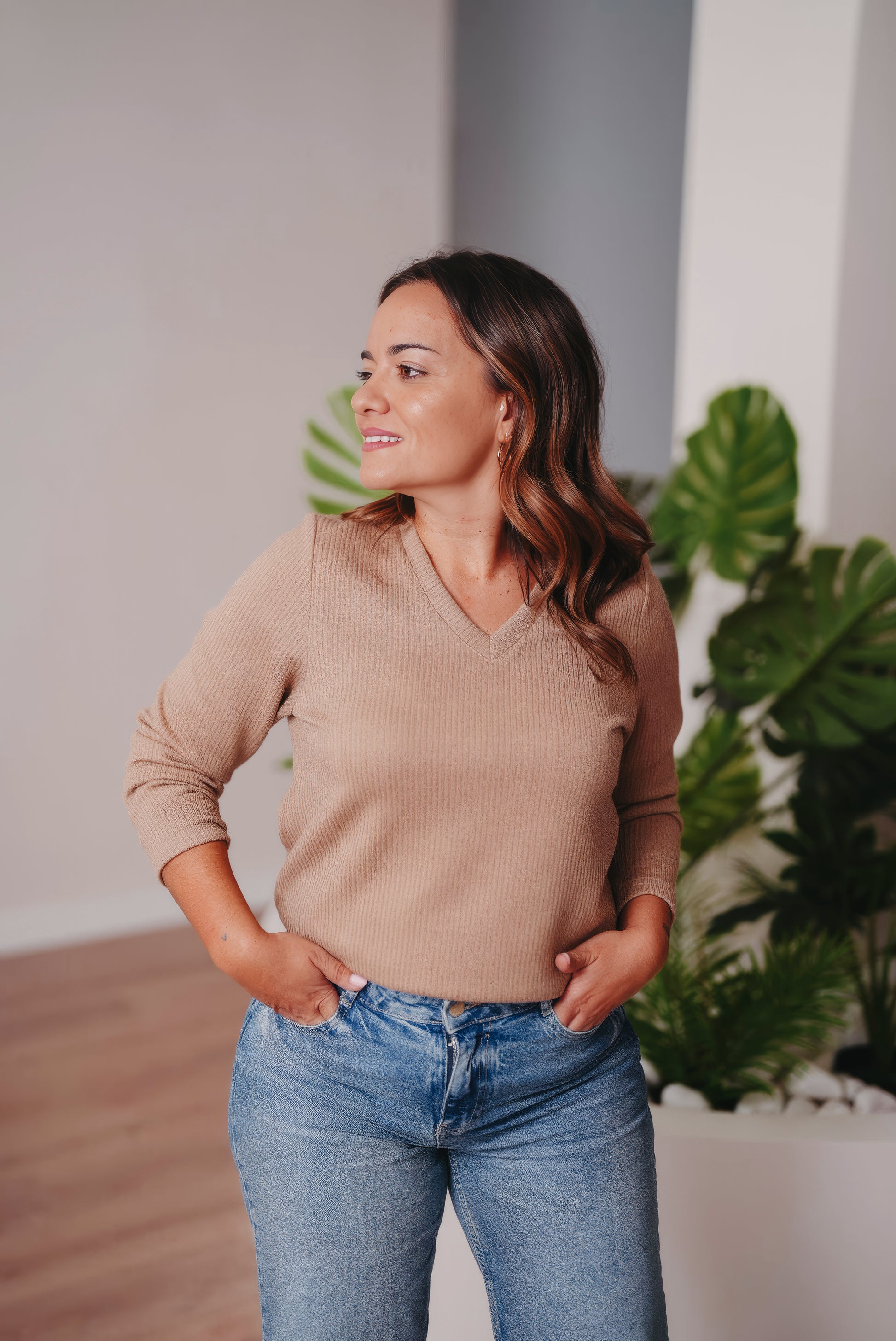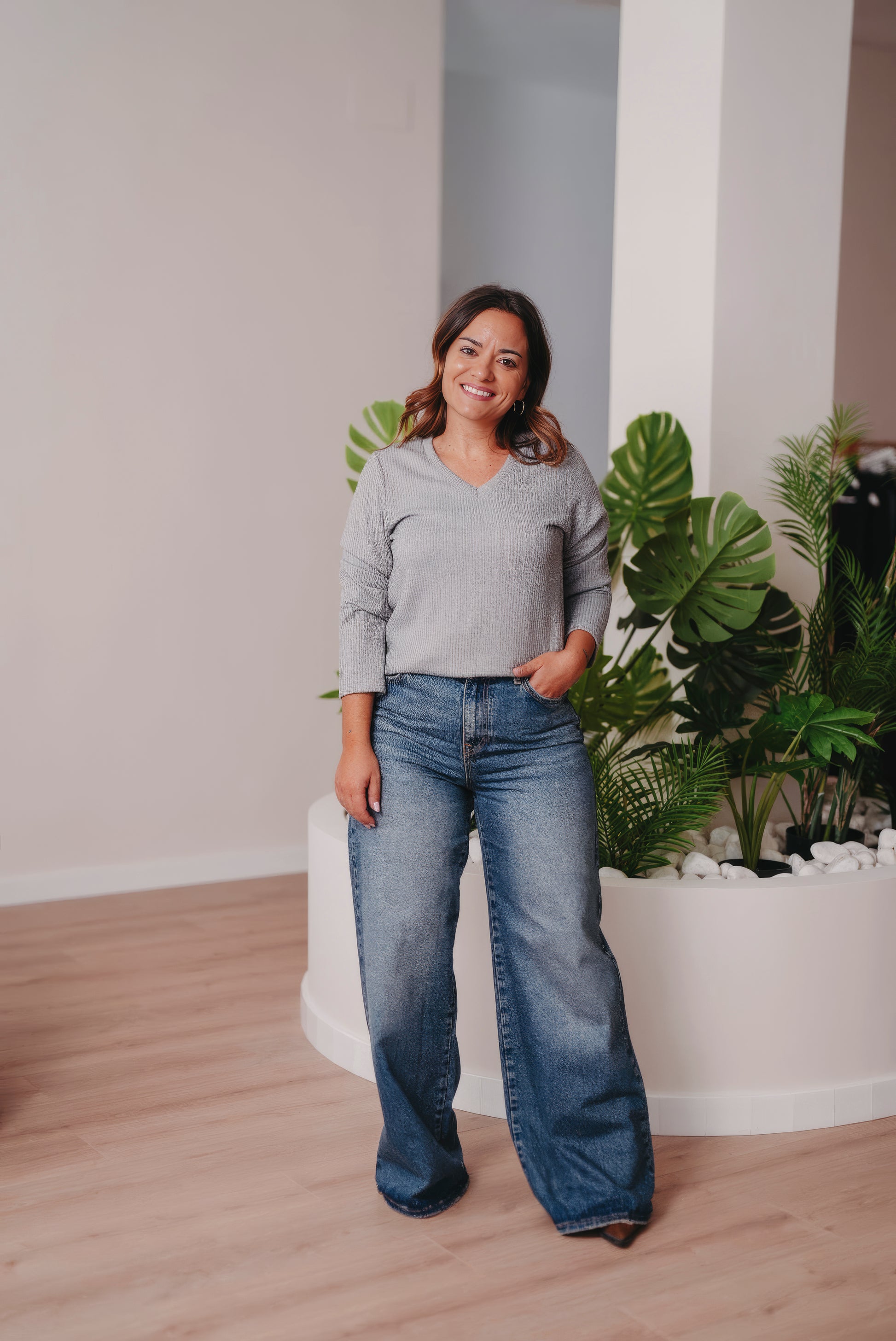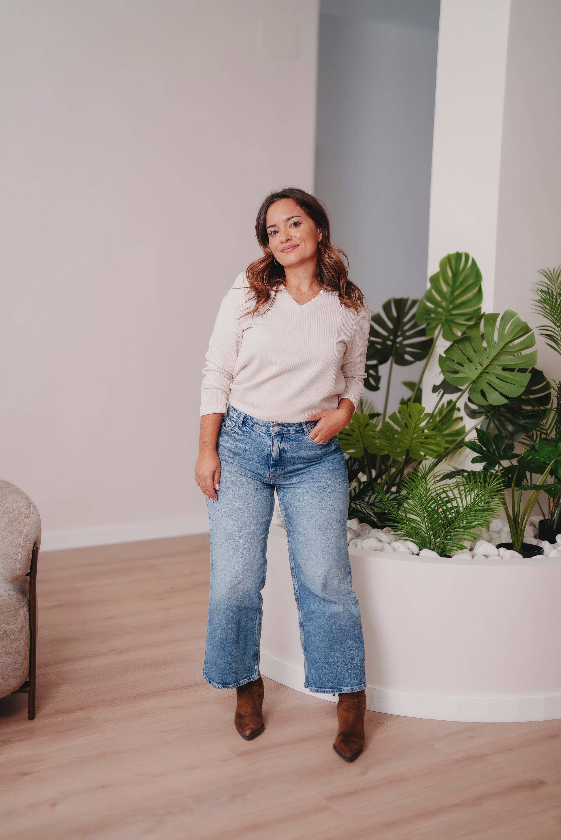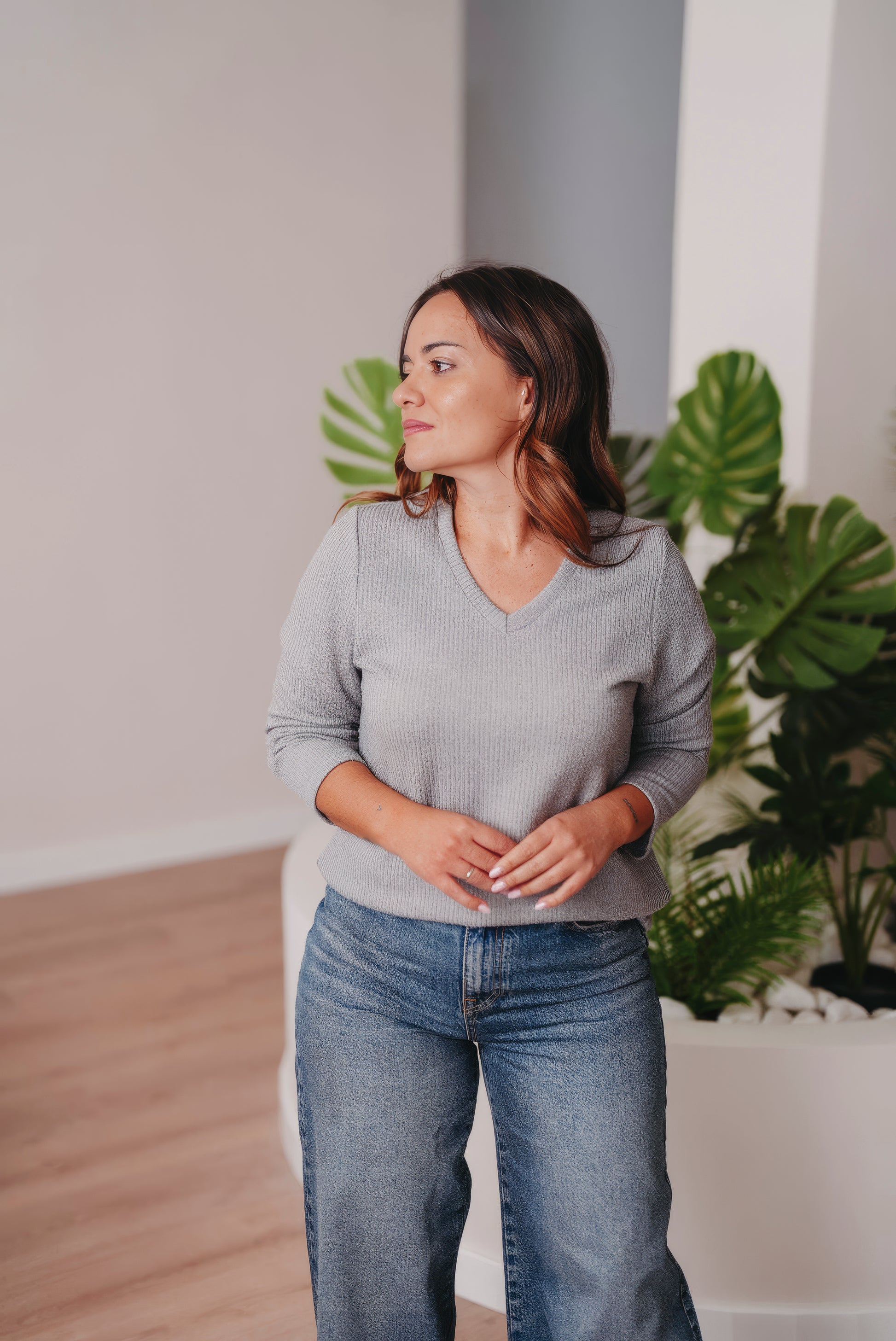 Jersey manga larga de punto canalé grueso, corte recto sin aberturas laterales.