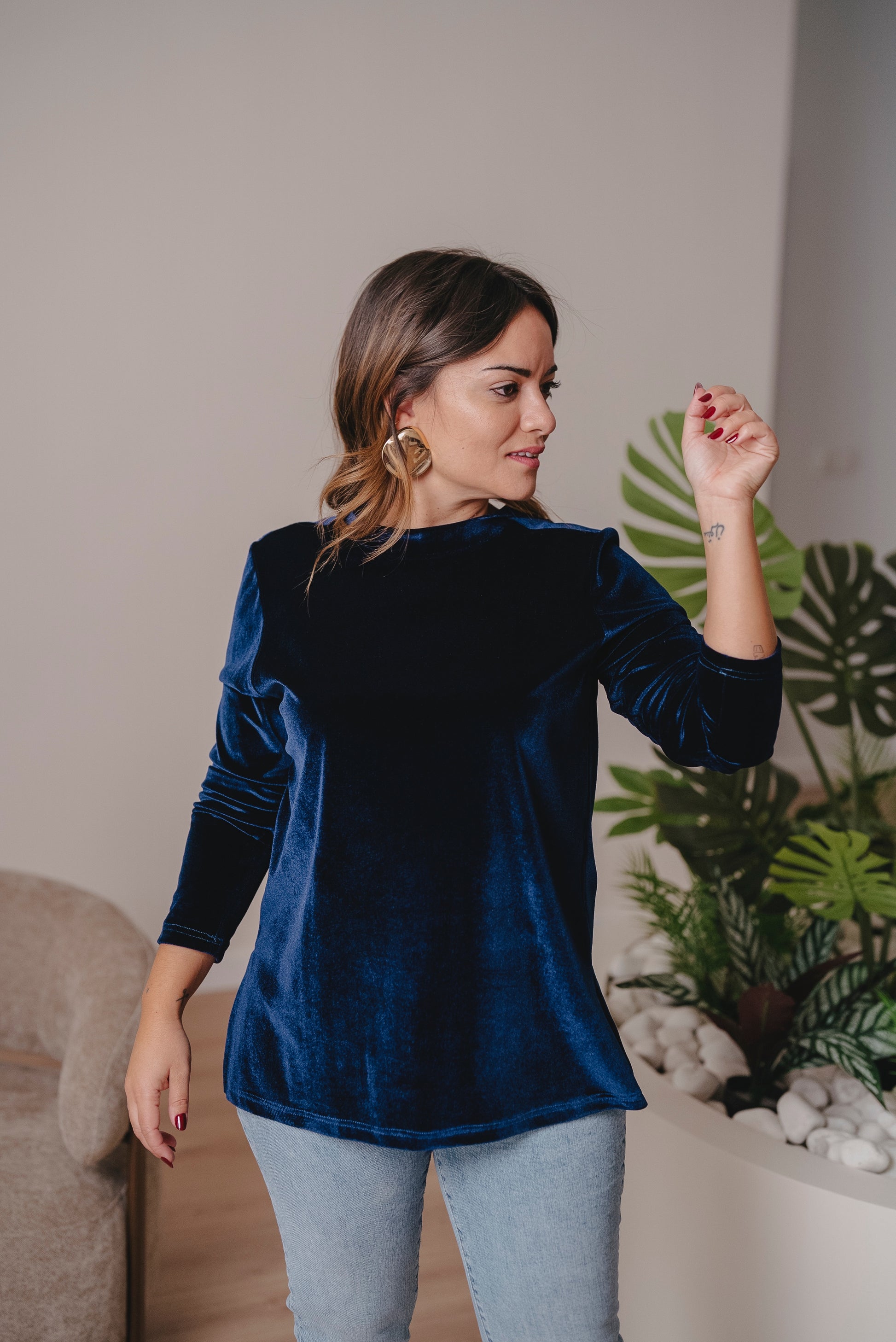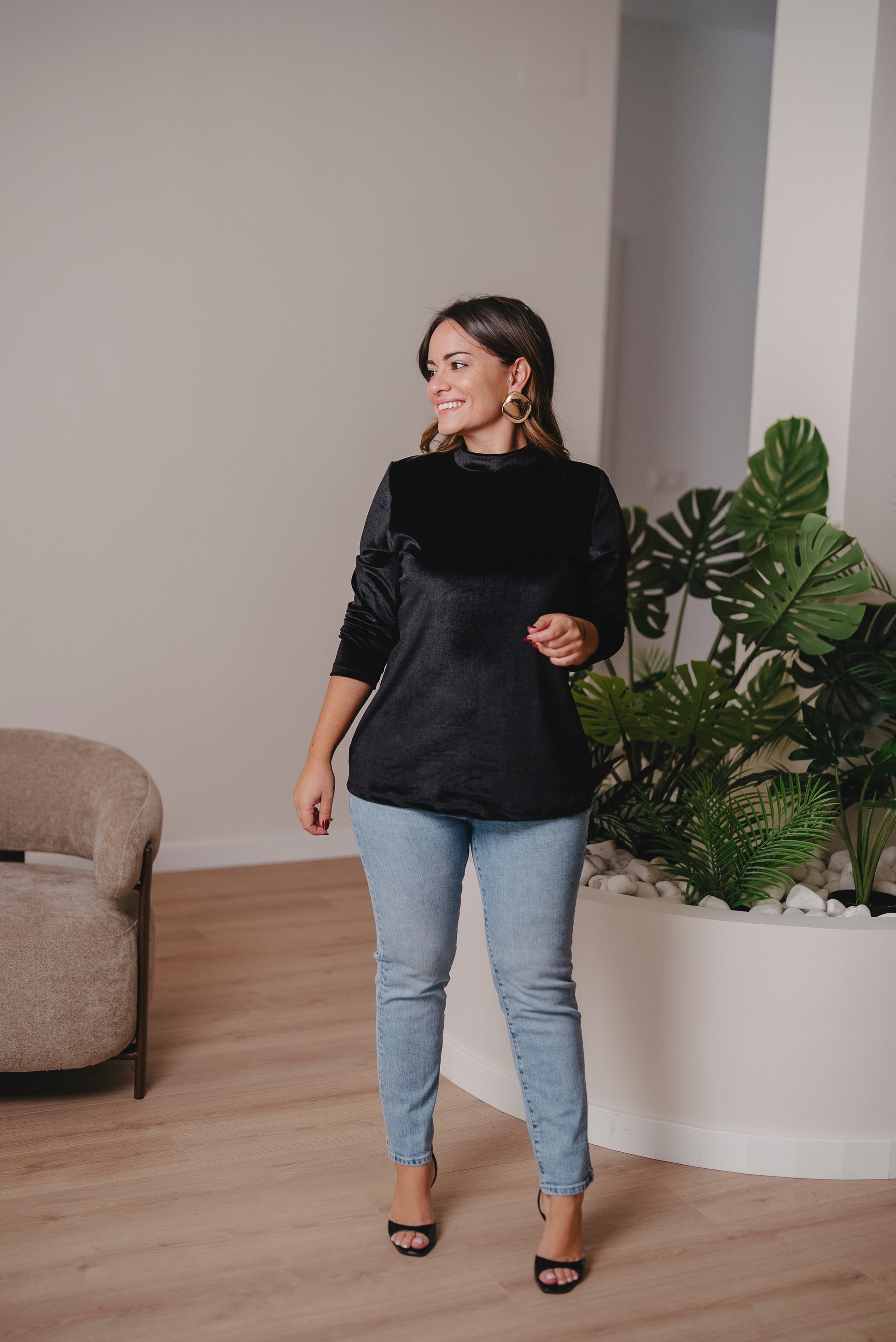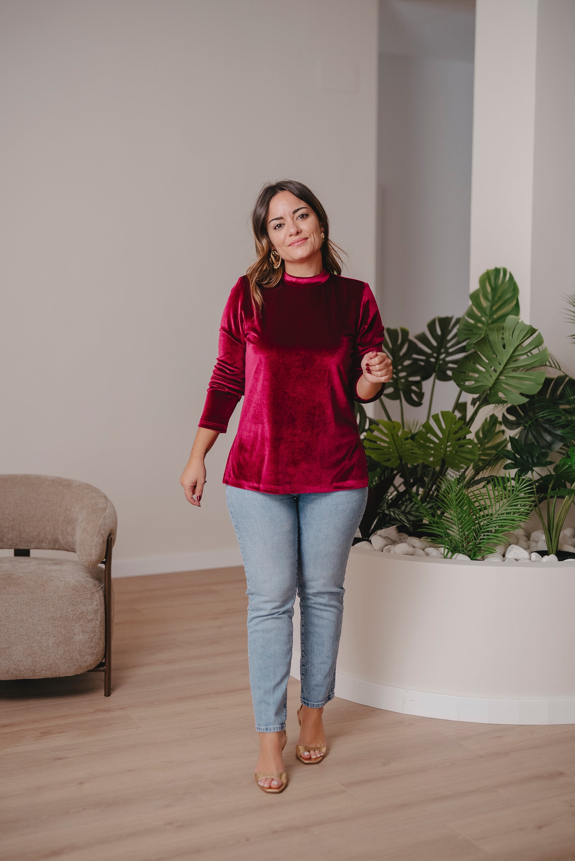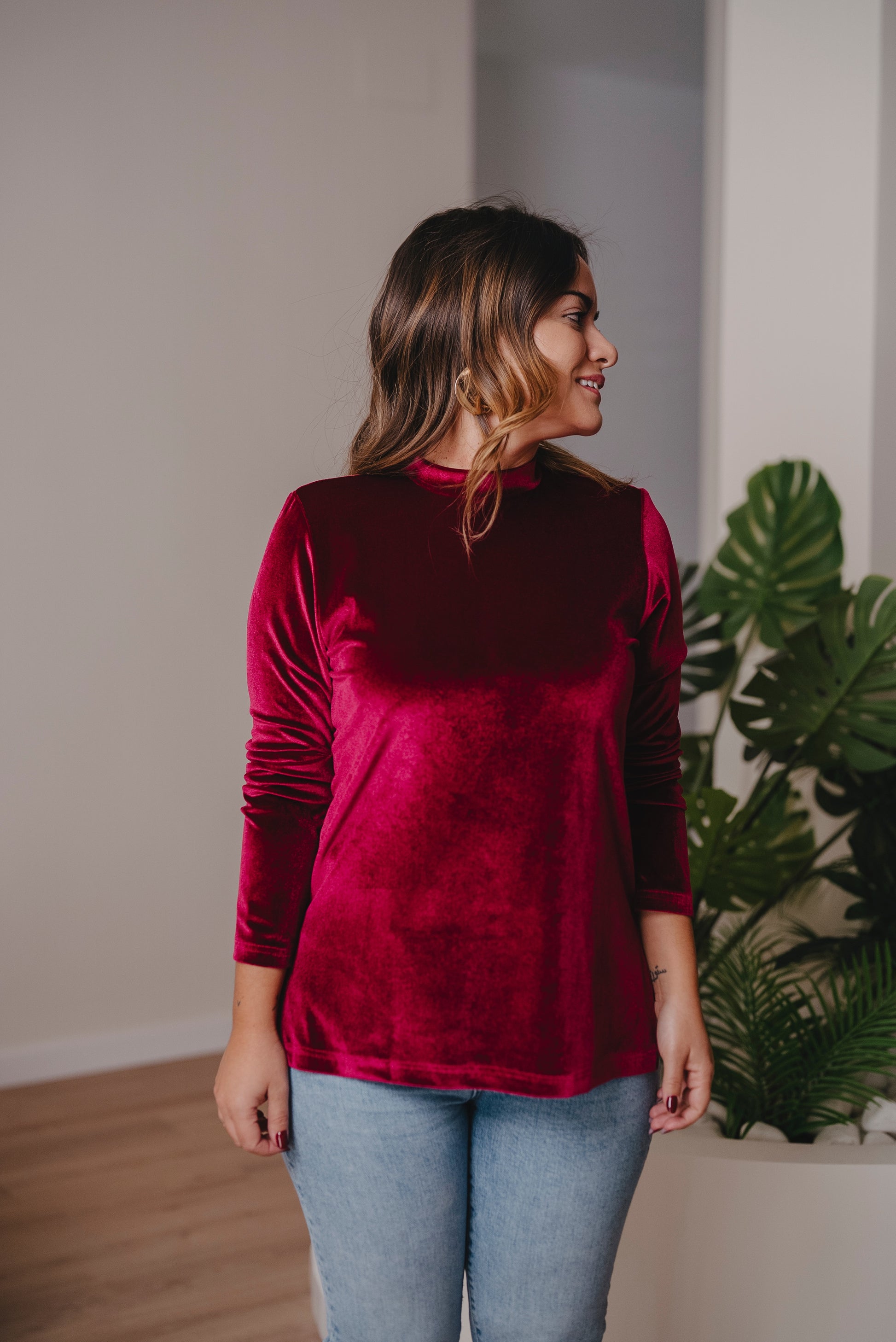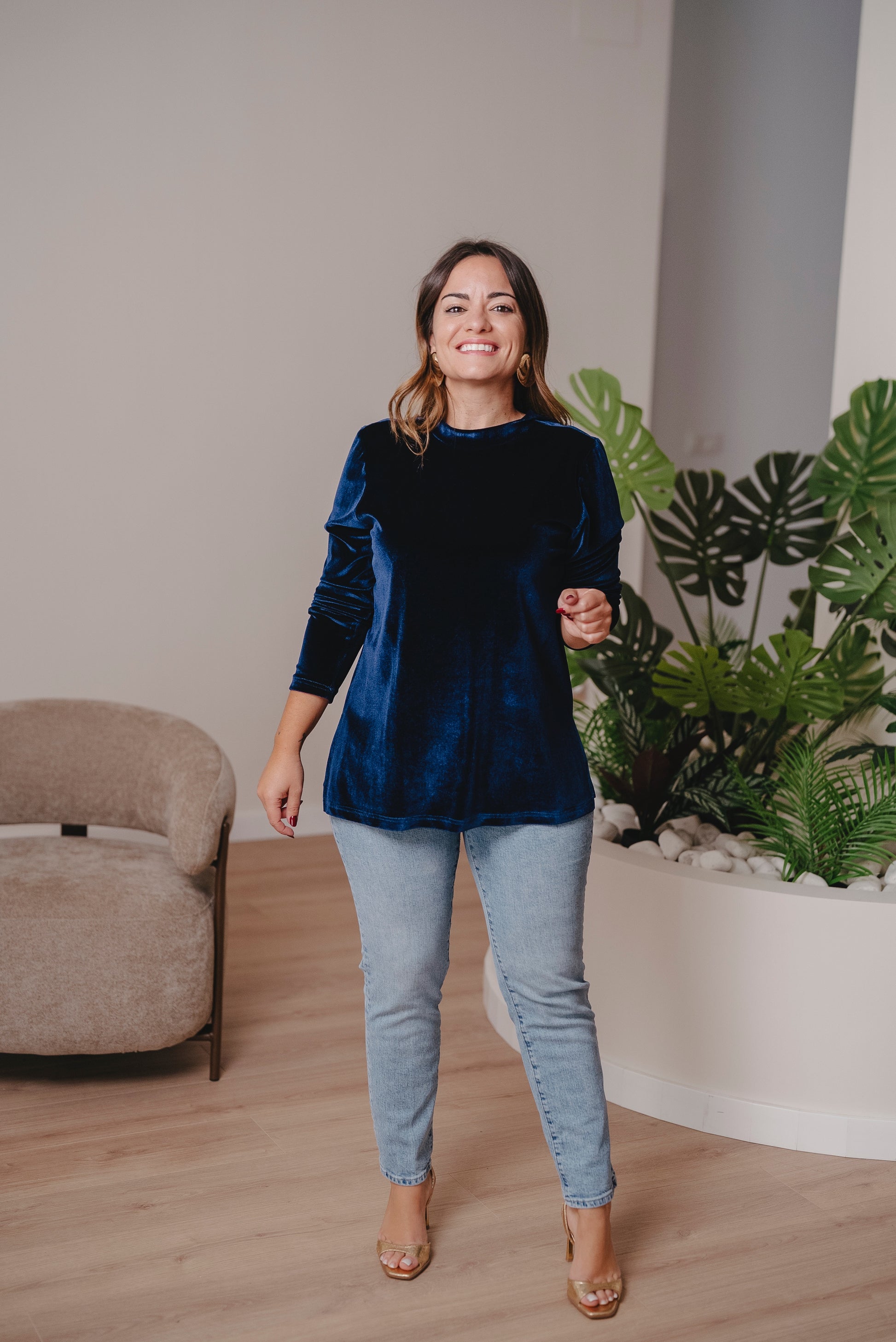 Jersey de manga larga con cuello redondo y corte evasé. Perfecto para llevarlo por dentro o por fuera, con faldas, vaqueros o pantalón en el mismo tejido.
