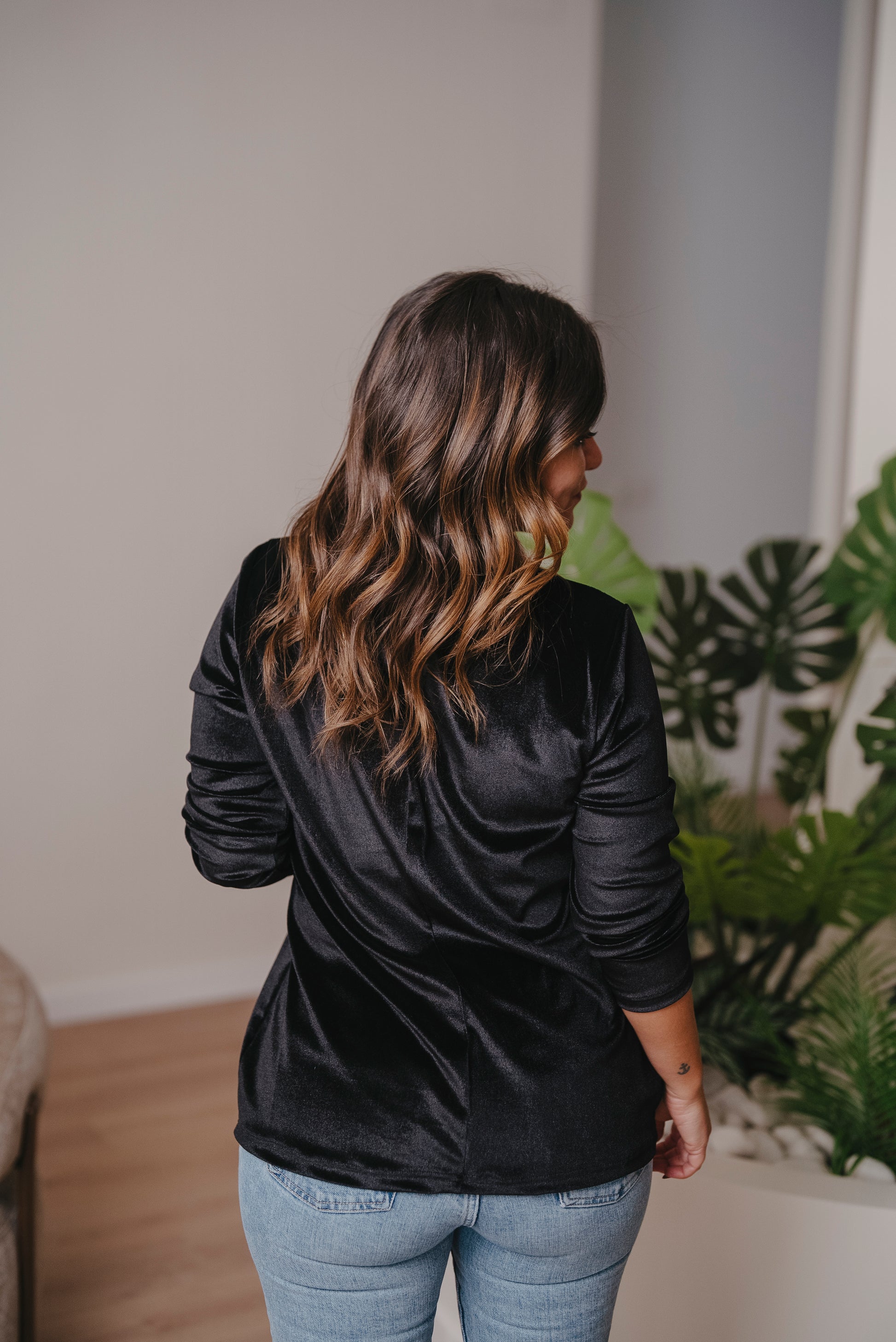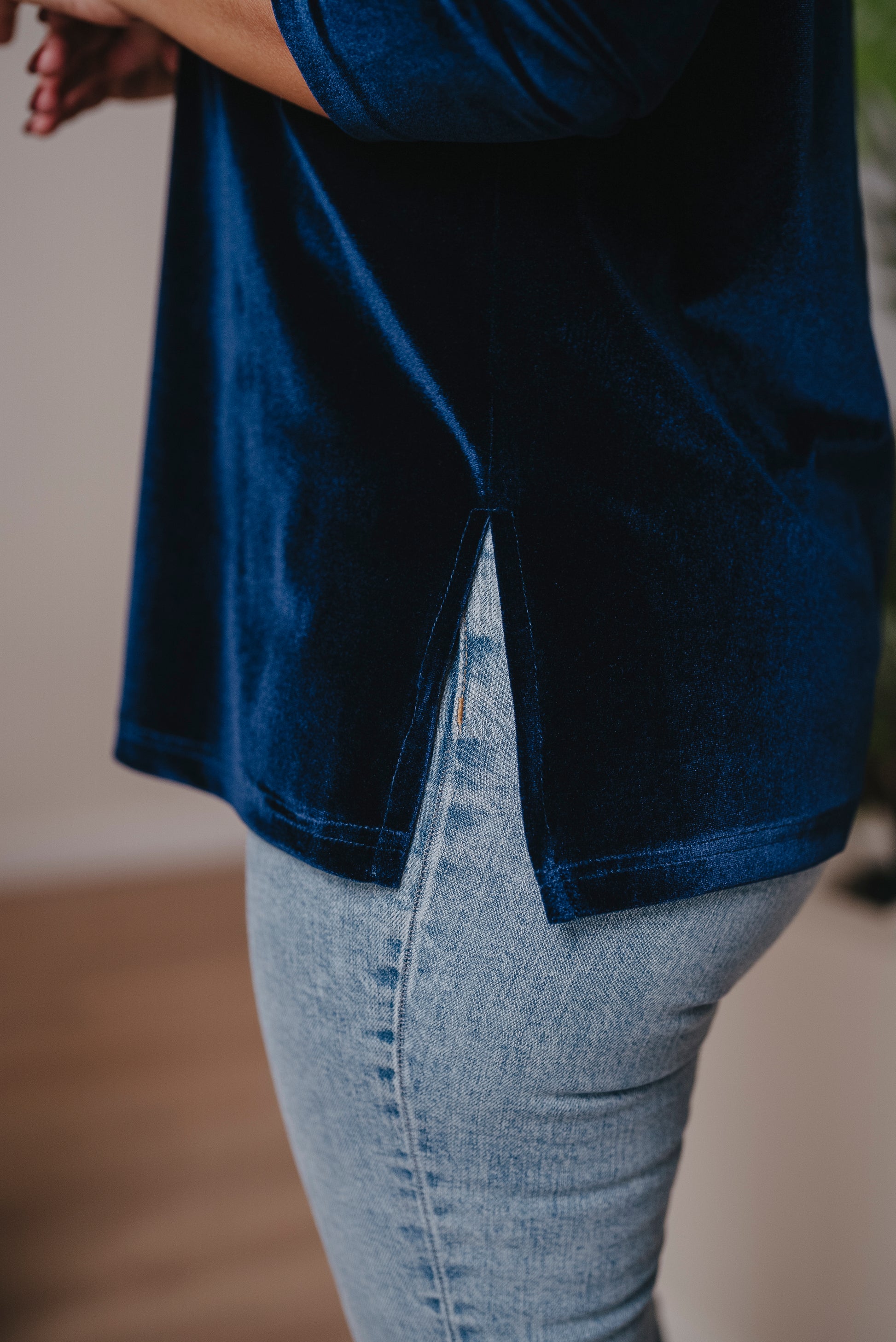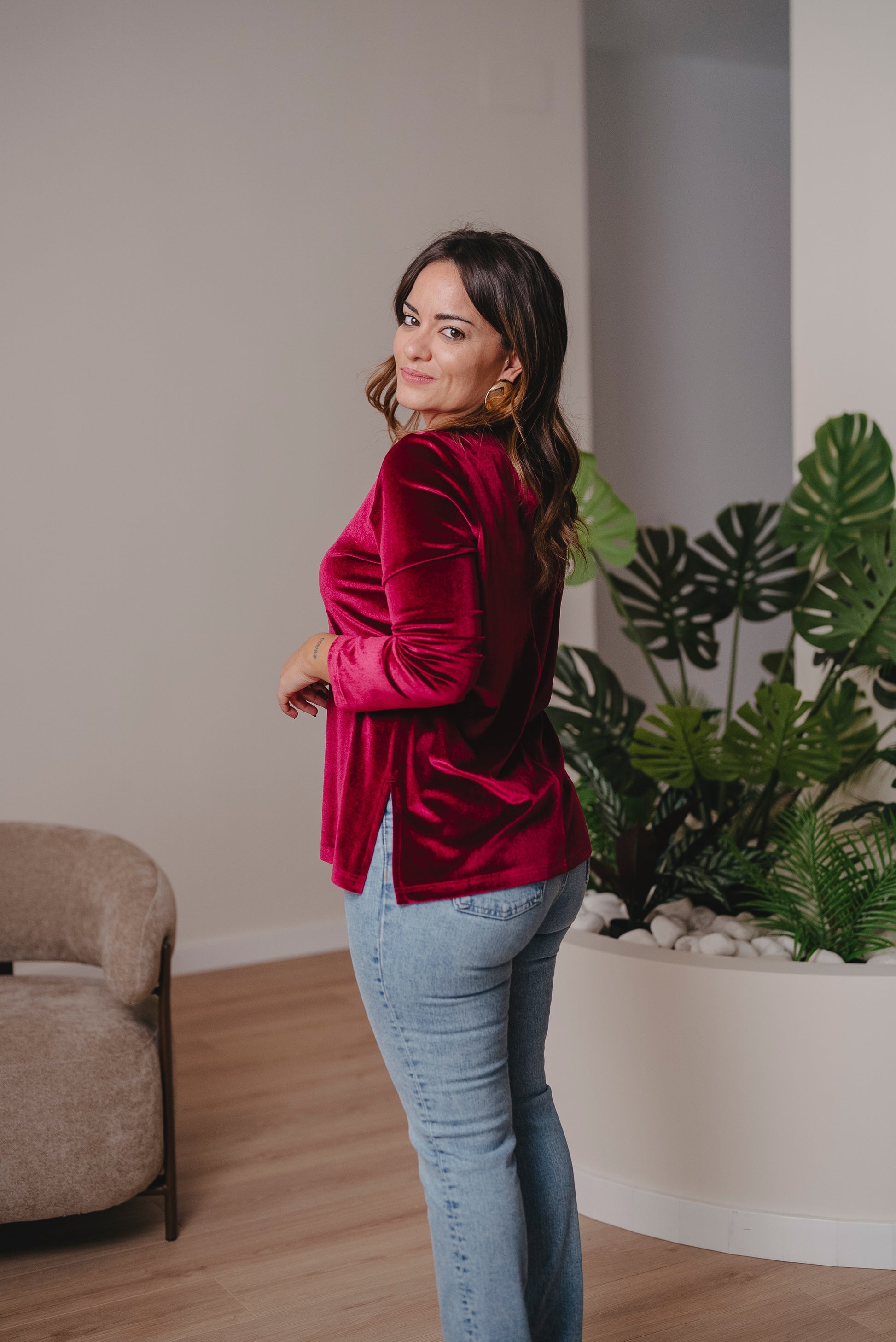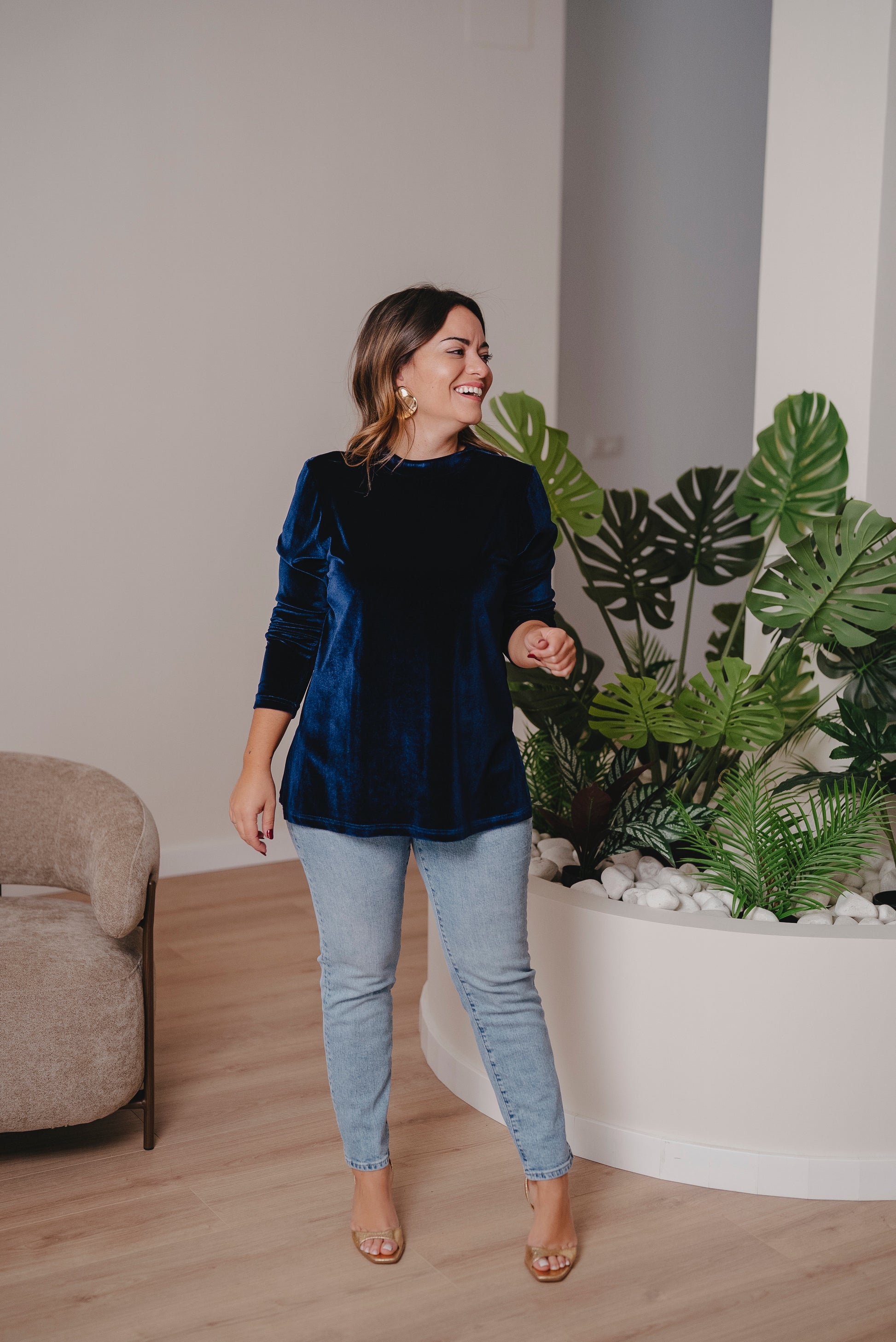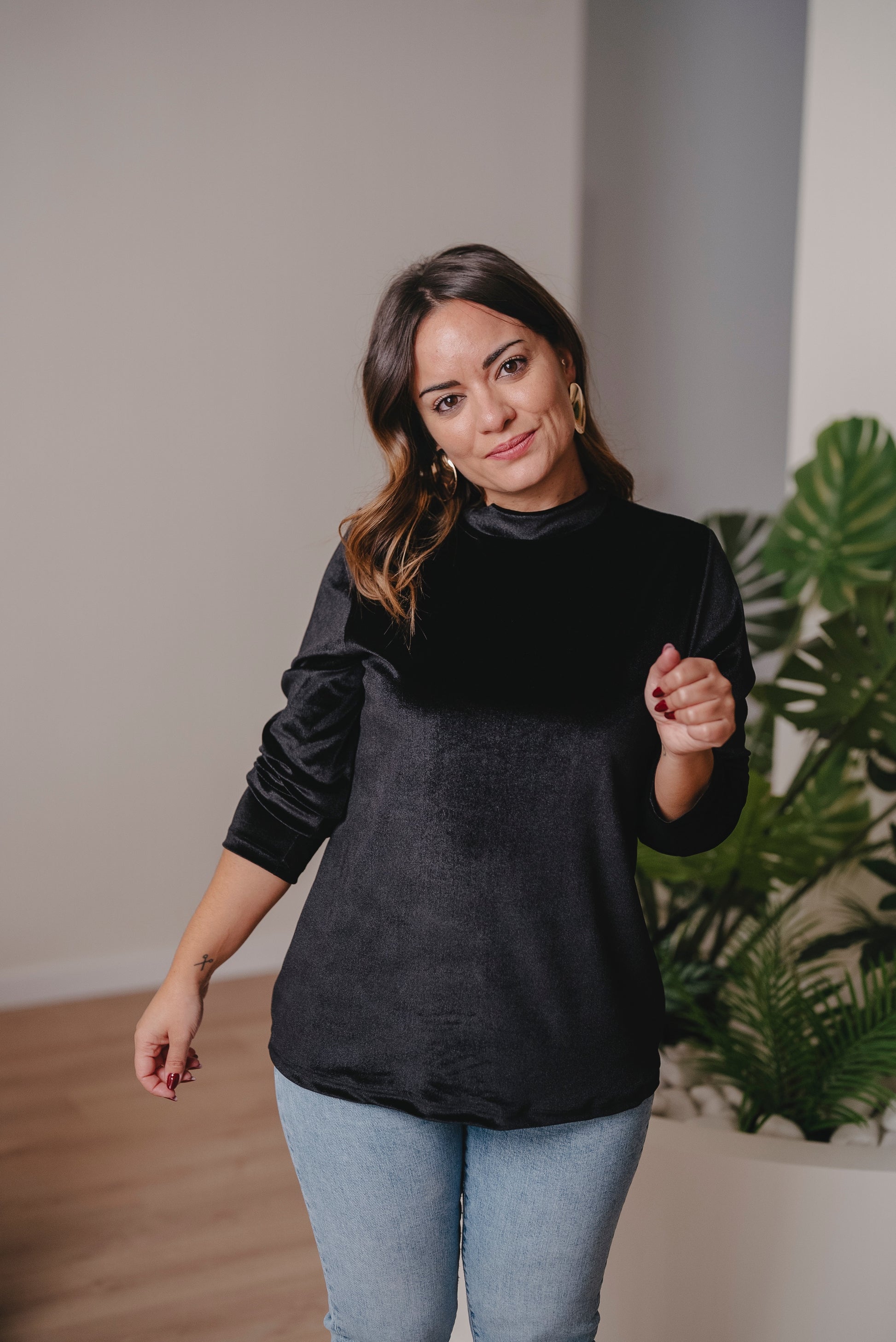 Jersey de manga larga con cuello redondo y corte evasé. Perfecto para llevarlo por dentro o por fuera, con faldas, vaqueros o pantalón en el mismo tejido.