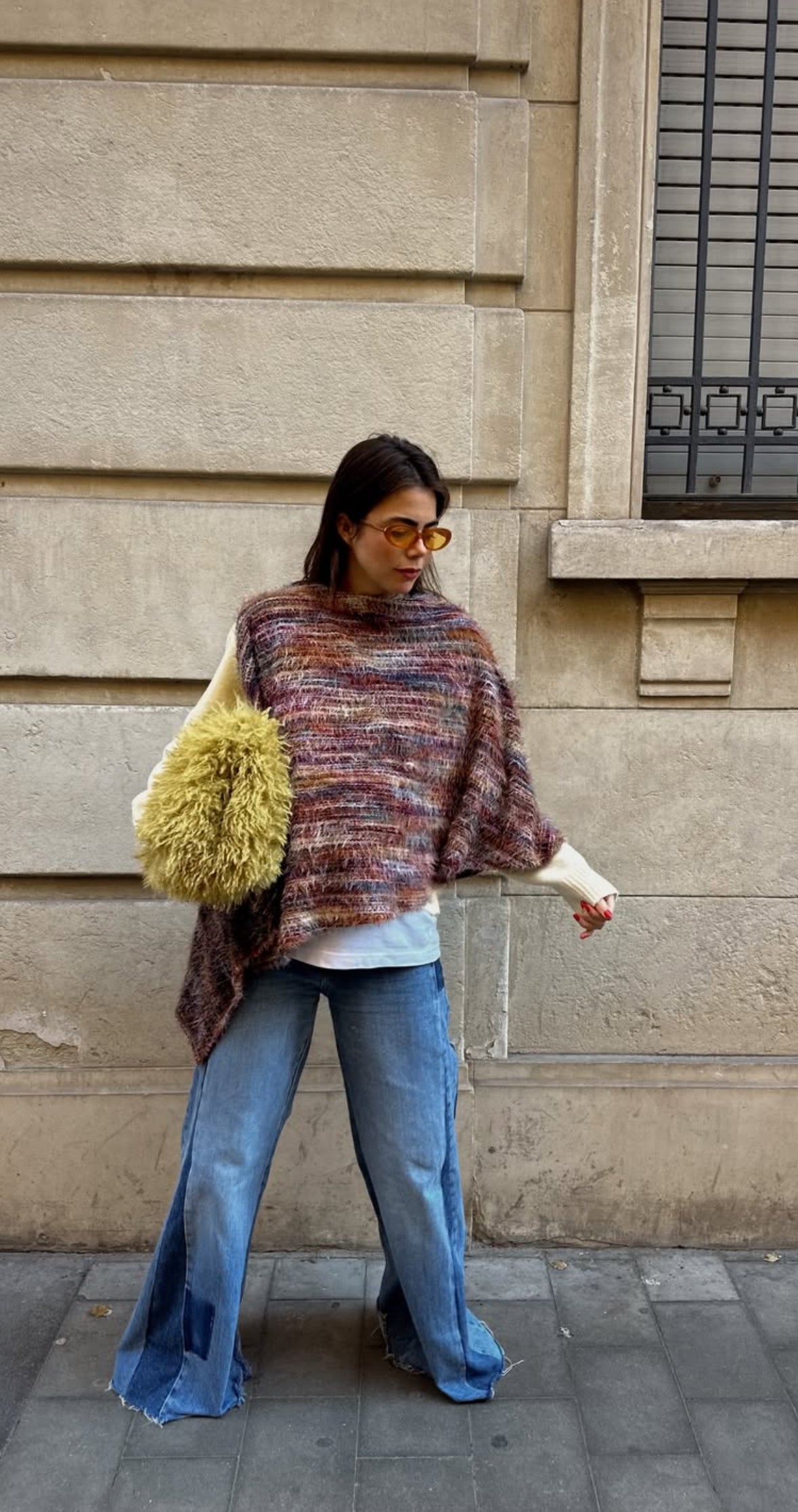 Poncho de punto de corte asimétrico. Lleva una abertura para introducir la cabeza y una abertura lateral.