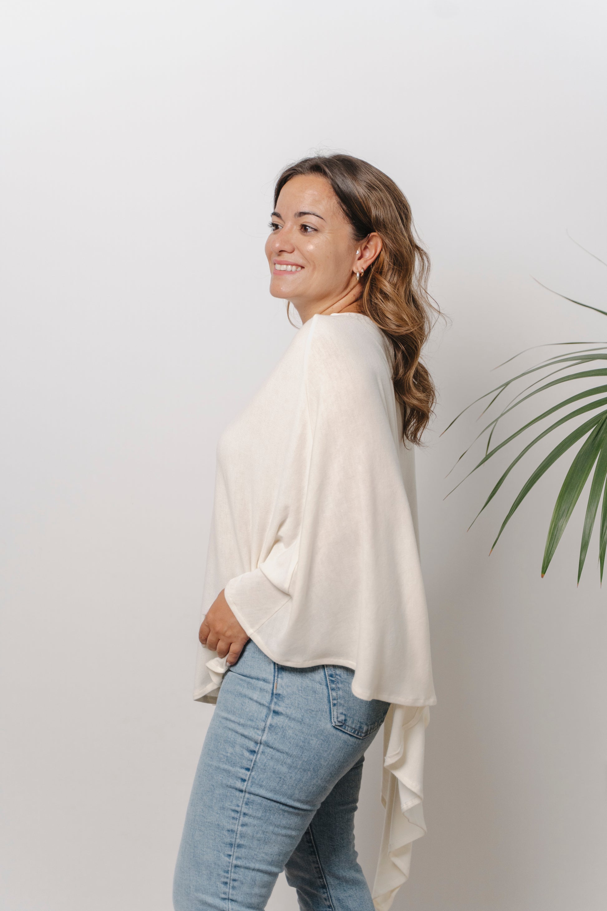 Poncho de punto de corte asimétrico. Lleva una abertura para introducir la cabeza y una abertura lateral.