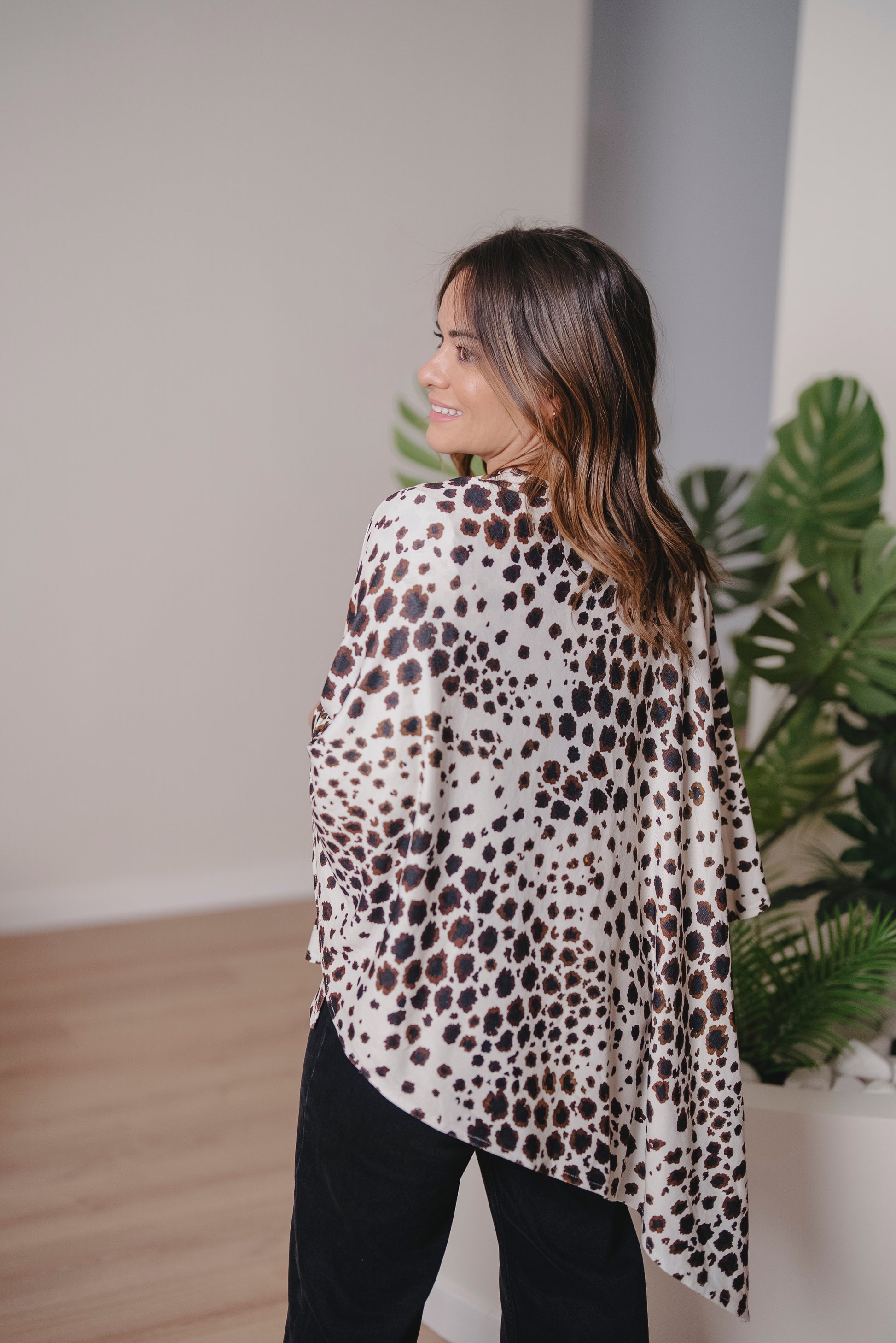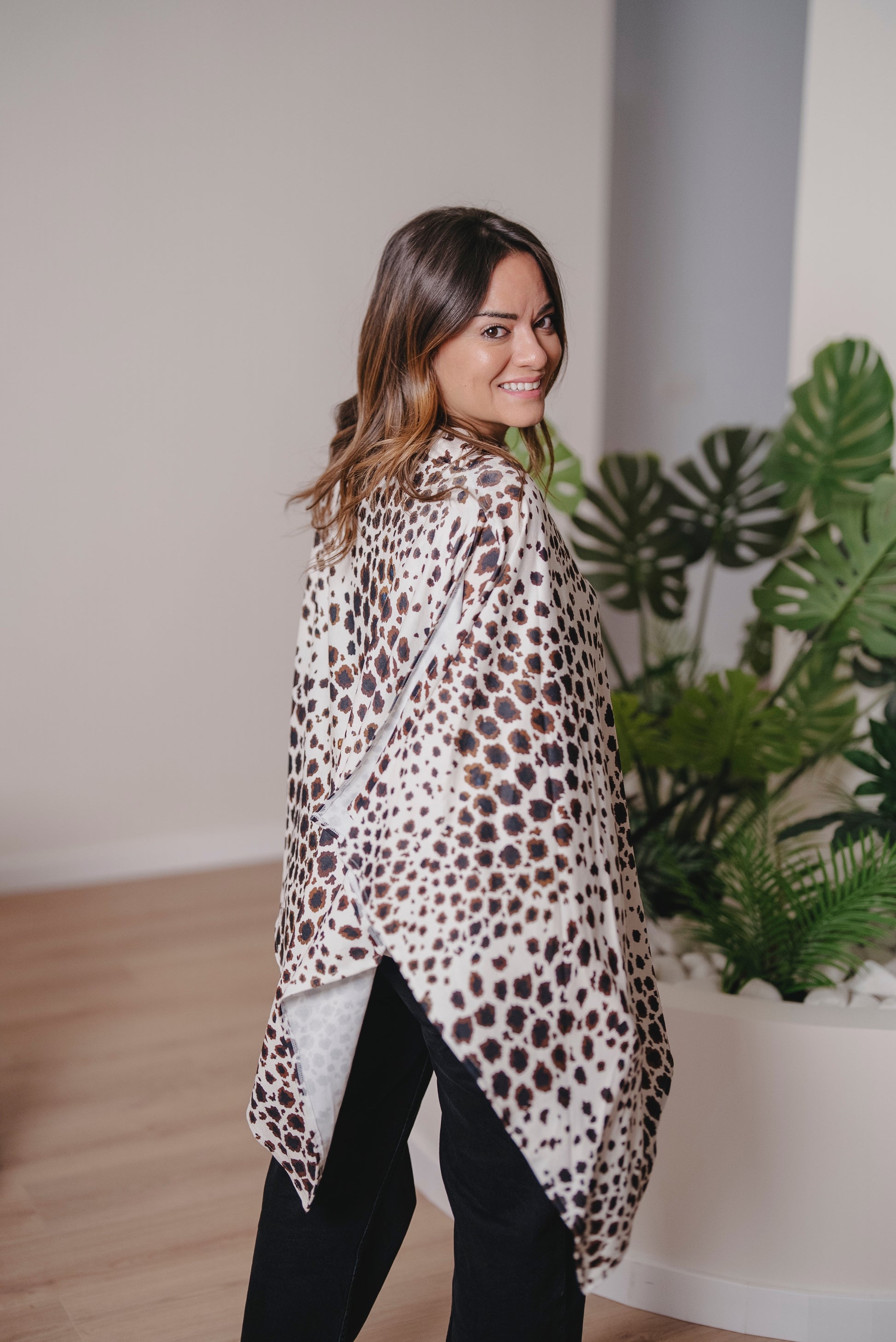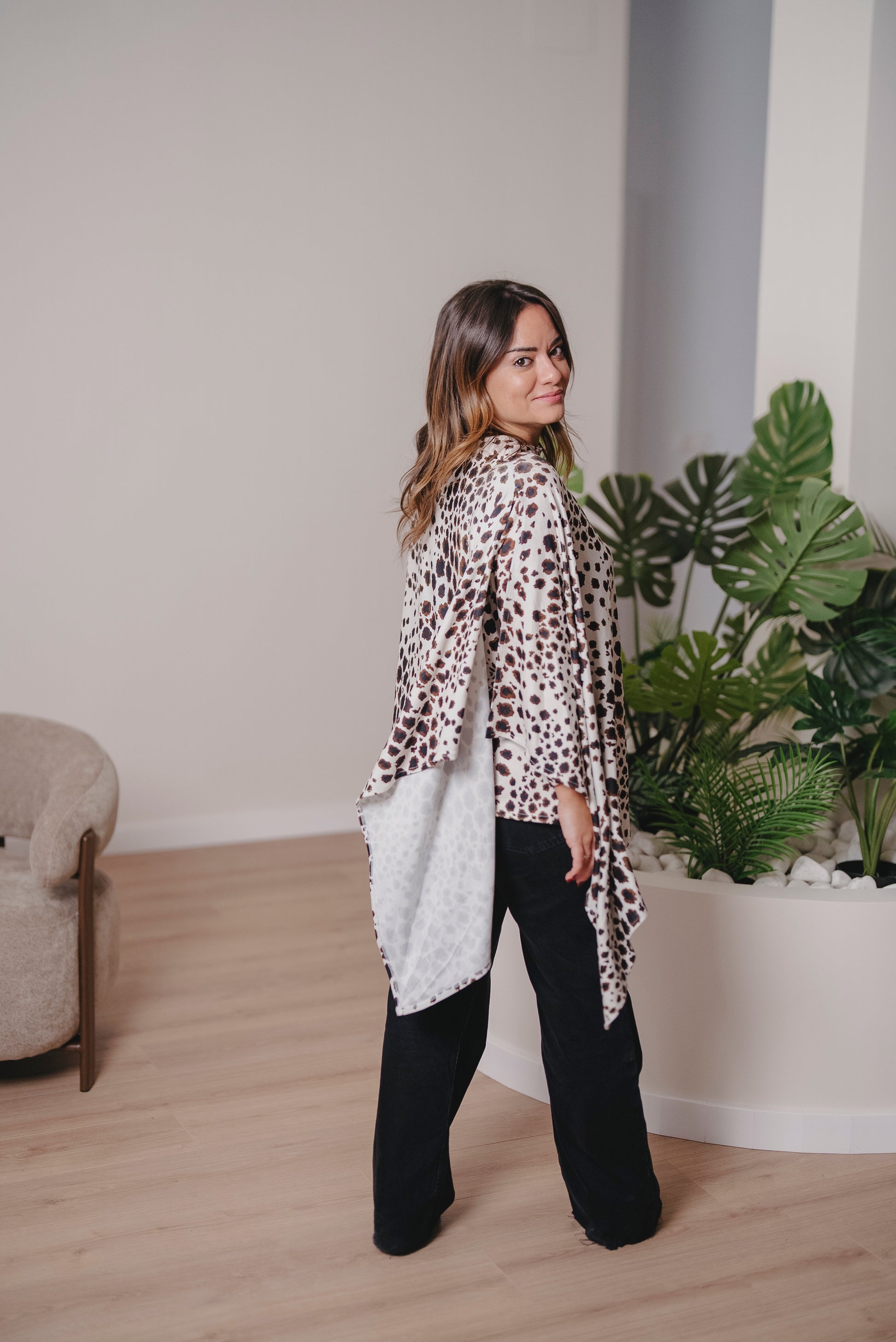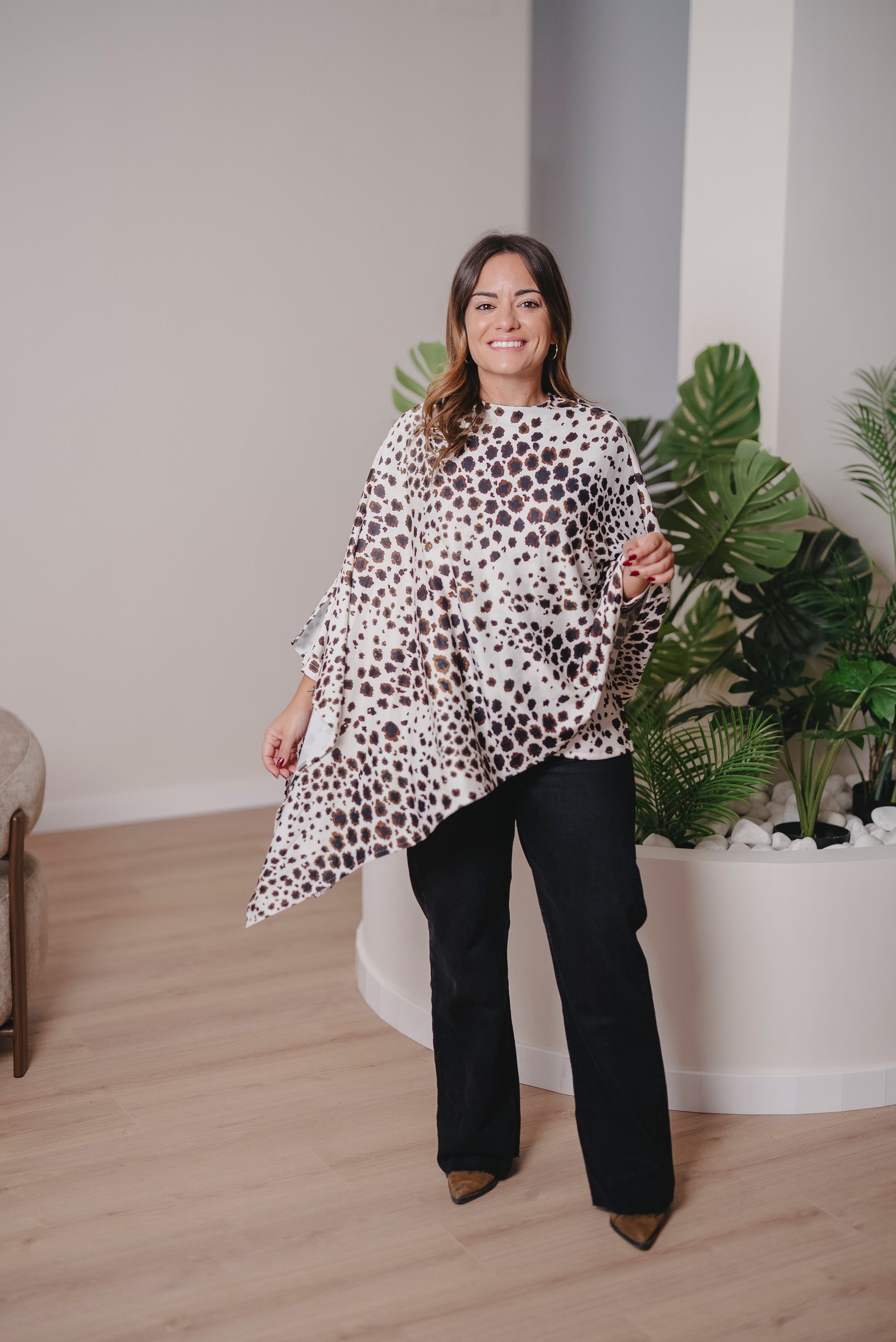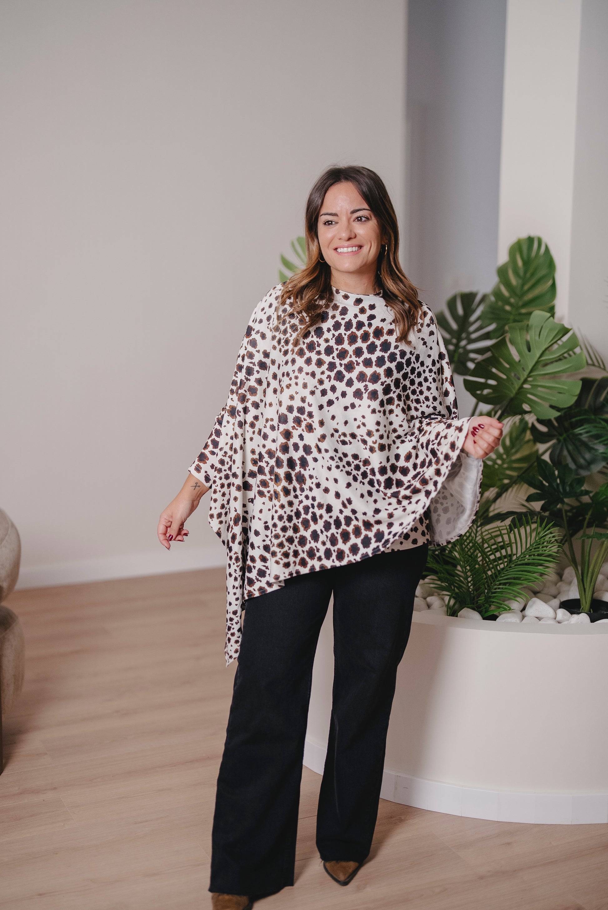 Poncho estampado de punto de corte asimétrico. Lleva una abertura para introducir la cabeza y una abertura lateral.