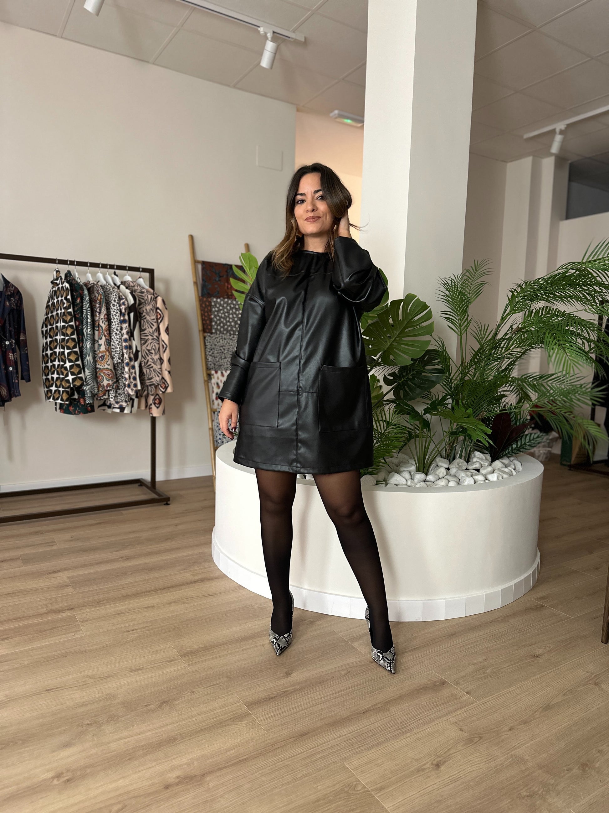 Es un vestido de corte oversized con bolsillos. Se puede usar tanto de día como de noche, creando un look moderno y elegante.