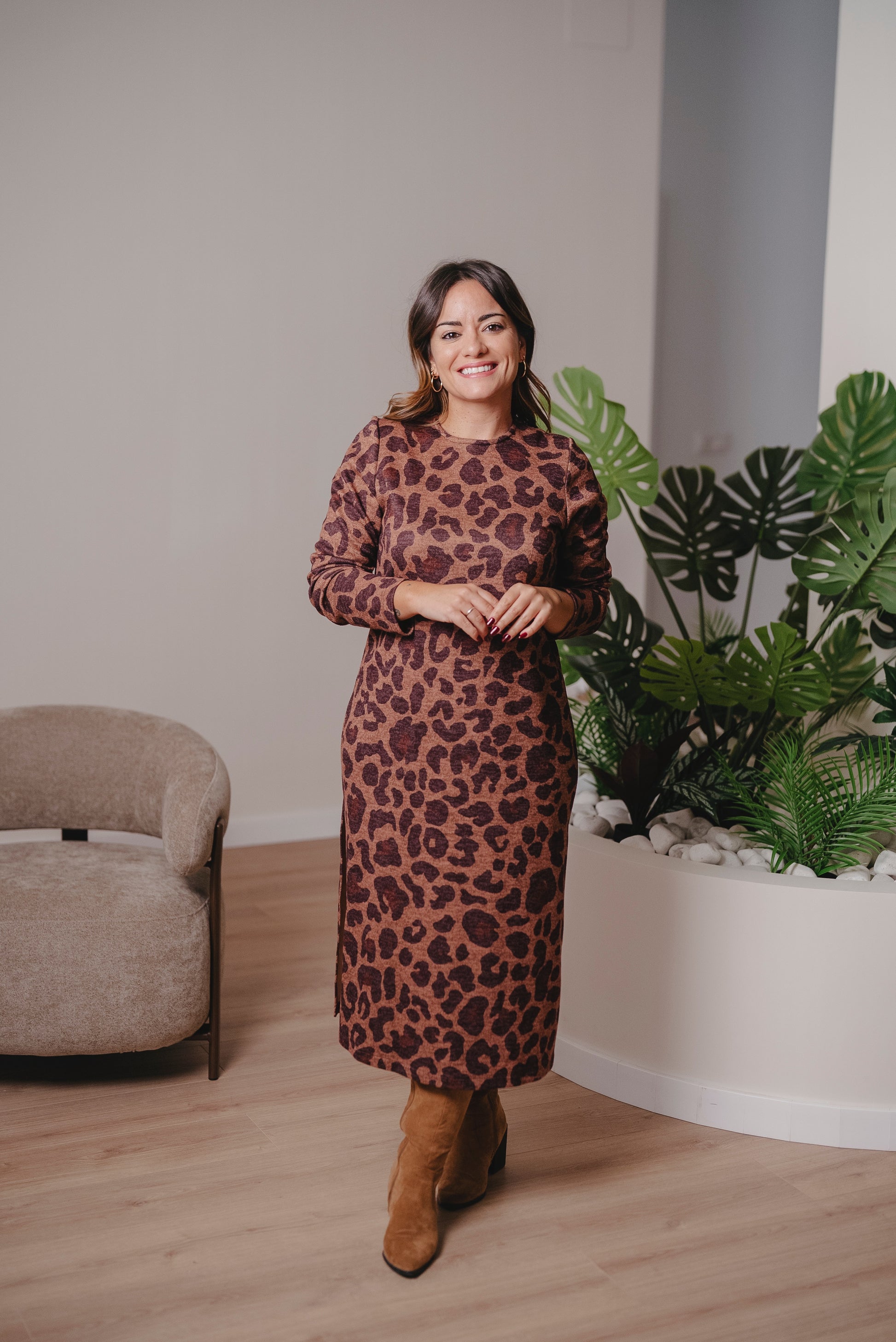 Vestido midi cuello redondo y lagrima detrás con dos aberturas a los lados, confeccionado en un punto gustoso en estampado animal print en camel con la mancha en choco.