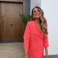 Cierre cruzado en el delantero con botones grandes forrados y aperturas en los laterales.